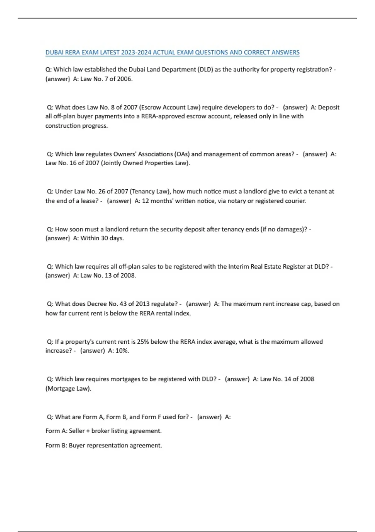 DUBAI RERA EXAM LATEST 2023-2024 ACTUAL EXAM QUESTIONS AND CORRECT ANSWERS