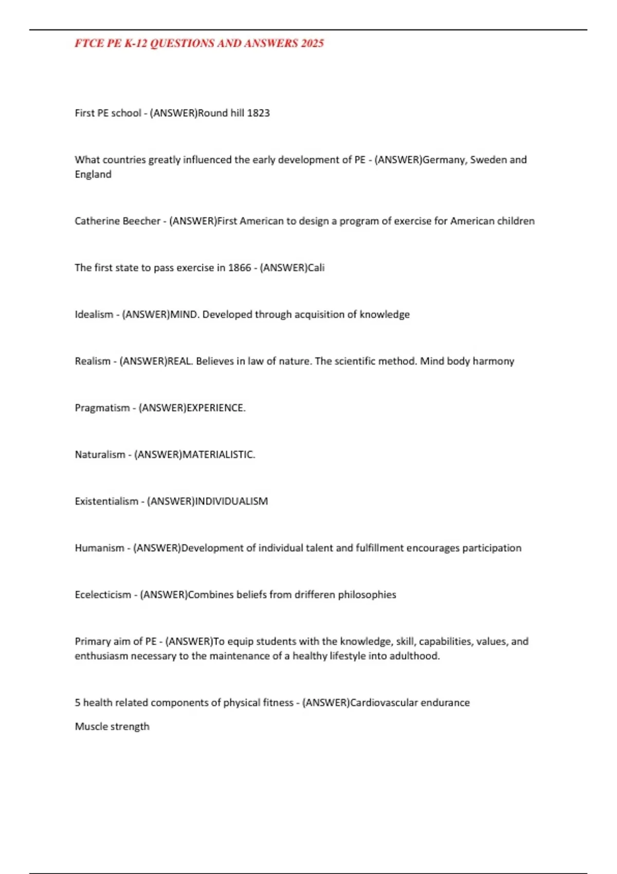 , FTCE PE K-12 QUESTIONS AND ANSWERS 2025