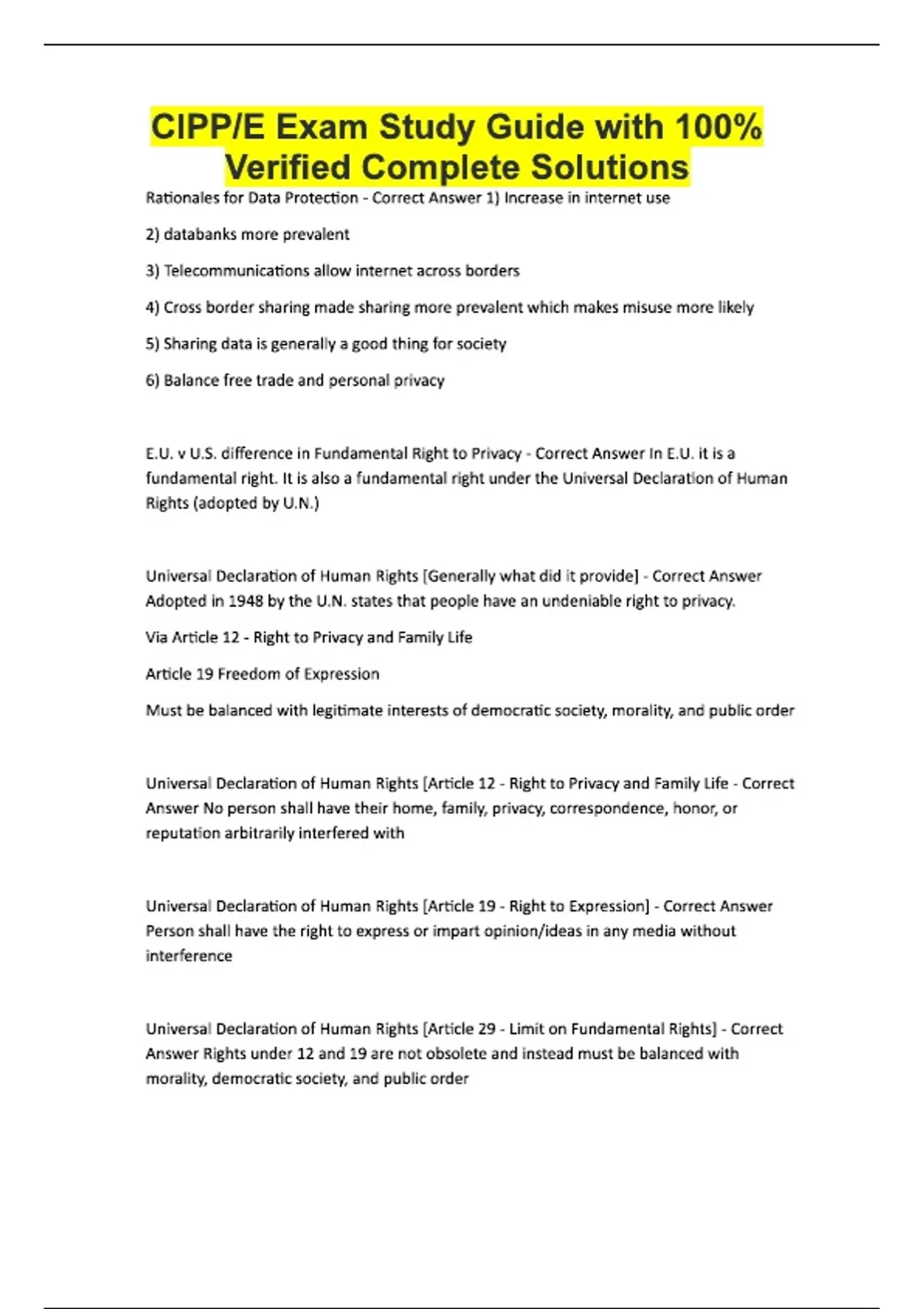 CIPP/E Exam Study Guide with 100% Verified Complete Solutions Rationales for Data Protection - Correct Answer 1) Increase in internet use 2) databanks more prevalent 3) Telecommunications allow internet across borders 4) Cross border sharing made sharing more prevalent which makes misuse more likely 5) Sharing data is generally a good thing for society 6) Balance free trade and personal privacy E.U. v U.S. difference in Fundamental Right to Privacy - Correct Answer In E.U. it is a fundamental right. It is also a fundamental right under the Universal Declaration of Human Rights (adopted by U.N.) Universal Declaration of Human Rights [Generally what did it provide] - Correct Answer Adopted in 1948 by the U.N. states that people have an undeniable right to privacy. Via Article 12 - Right to Privacy and Family Life Article 19 Freedom of Expression Must be balanced with legitimate interests of democratic society, morality, and public order Universal Declaration of Human Rights [Article 12 - Right to Privacy and Family Life - Correct Answer No person shall have their home, family, privacy, correspondence, honor, or reputation arbitrarily interfered with Universal Declaration of Human Rights [Article 19 - Right to Expression] - Correct Answer Person shall have the right to express or impart opinion/ideas in any media without interference Universal Declaration of Human Rights [Article 29 - Limit on Fundamental Rights] - Correct Answer Rights under 12 and 19 are not obsolete and instead must be balanced with morality, democratic society, and public order European Declaration of Human Rights [Generally] - Correct Answer Adopted in 1958 by the European Commission; applied only to European member states; similar to Constitution of the U.S. fundamental rights + data privacy rights of the Universal Declaration of Huma