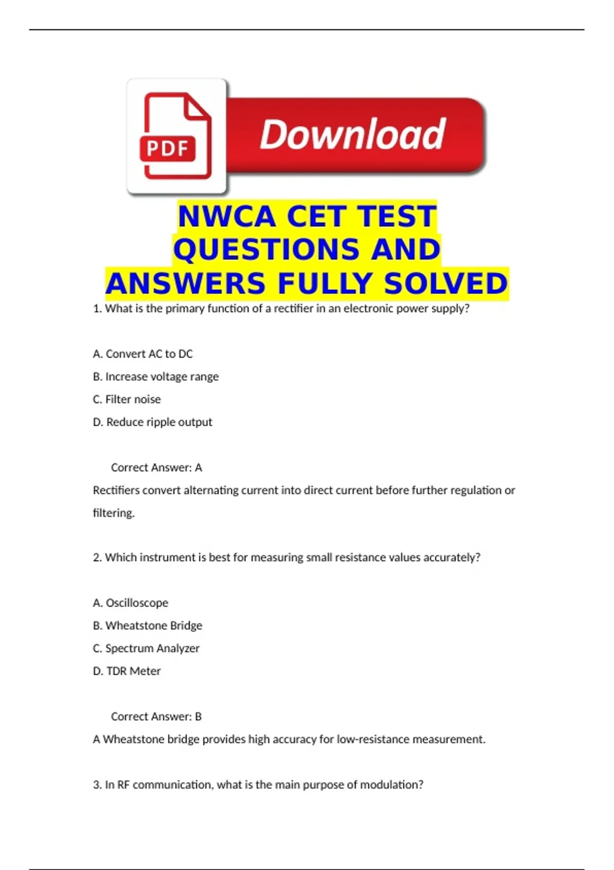 NWCA CET TEST QUESTIONS AND VERIFIED ANSWERS FULLY SOLVED