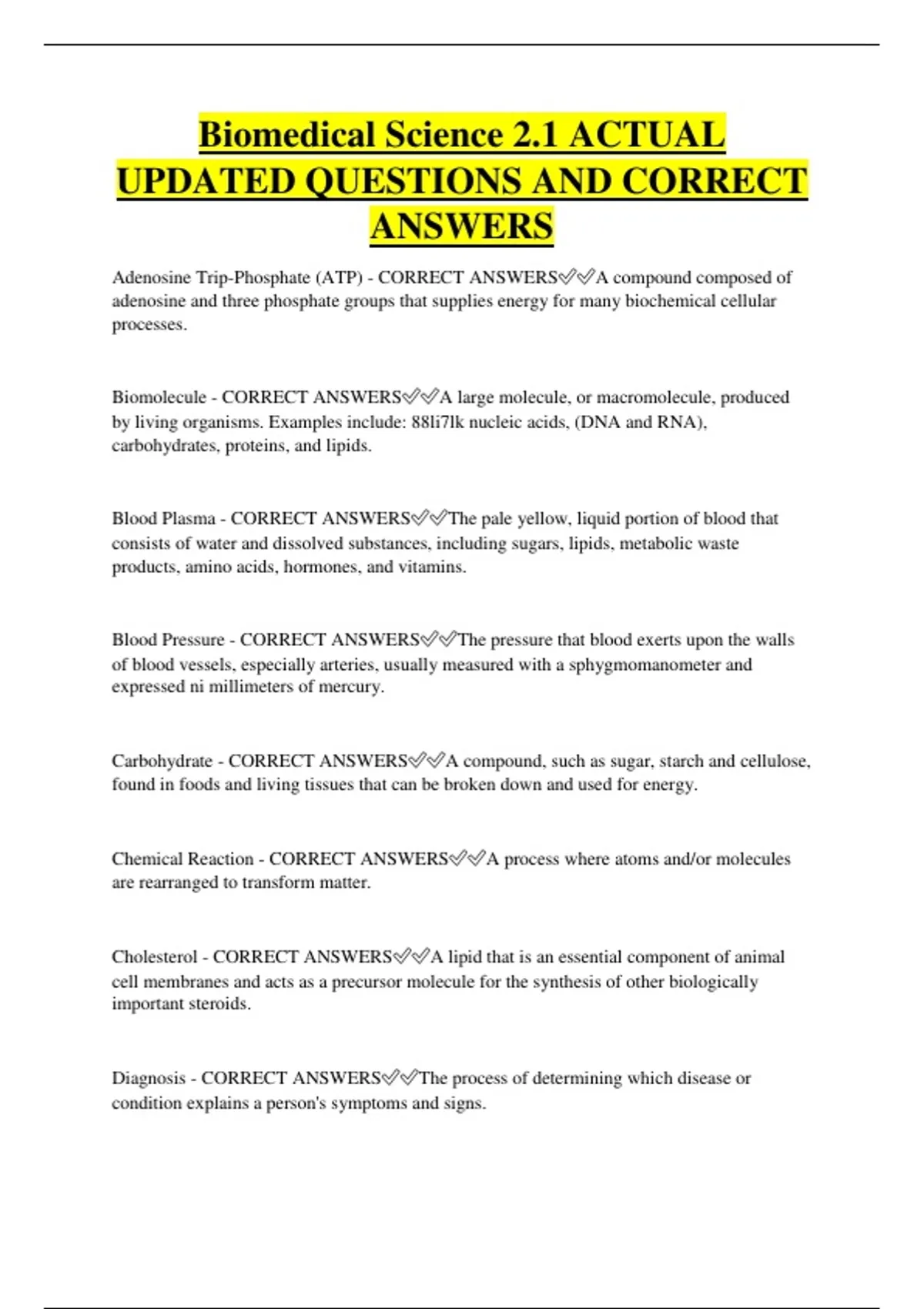 Biomedical Science 2.1 ACTUAL UPDATED QUESTIONS AND CORRECT ANSWERS Adenosine Trip-Phosphate (ATP) - CORRECT ANSWERSA compound composed of adenosine and three phosphate groups that supplies energy for many biochemical cellular processes. Biomolecule - CORRECT ANSWERSA large molecule, or macromolecule, produced by living organisms. Examples include: 88li7lk nucleic acids, (DNA and RNA), carbohydrates, proteins, and lipids. Blood Plasma - CORRECT ANSWERSThe pale yellow, liquid portion of blood that consists of water and dissolved substances, including sugars, lipids, metabolic waste products, amino acids, hormones, and vitamins. Blood Pressure - CORRECT ANSWERSThe pressure that blood exerts upon the walls of blood vessels, especially arteries, usually measured with a sphygmomanometer and expressed ni millimeters of mercury. Carbohydrate - CORRECT ANSWERSA compound, such as sugar, starch and cellulose, found in foods and living tissues that can be broken down and used for energy. Chemical Reaction - CORRECT ANSWERSA process where atoms and/or molecules are rearranged to transform matter. Cholesterol - CORRECT ANSWERSA lipid that is an essential component of animal cell membranes and acts as a precursor molecule for the synthesis of other biologically important steroids. Diagnosis - CORRECT ANSWERSThe process of determining which disease or condition explains a person's symptoms and signs. Diastole - CORRECT ANSWERSThe stage in a heartbeat when the heart is relaxed and the heart chambers fill with blood. Erythrocyte (Red Blood Cell) - CORRECT ANSWERSHemoglobin-rich, red blood cells that transport oxygen through a body. Erythrocytes give the red color to vertebrate blood and do not have nuclei. Glucagon - CORRECT ANSWERSA hormone secreted by pancreatic endocrine cells that raises blood glucose levels; an antagonist hormone to insulin. HIPPA - CORRECT ANSWERSHealth Insurance Portability and Accountability Act; A set of U.S. national standards that protect an individual's privacy rights related to their personal medical information. Homeostasis - CORRECT ANSWERSThe maintenance of stable internal physiological conditions (like body temperature or the pH of blood), which enables the optimal func