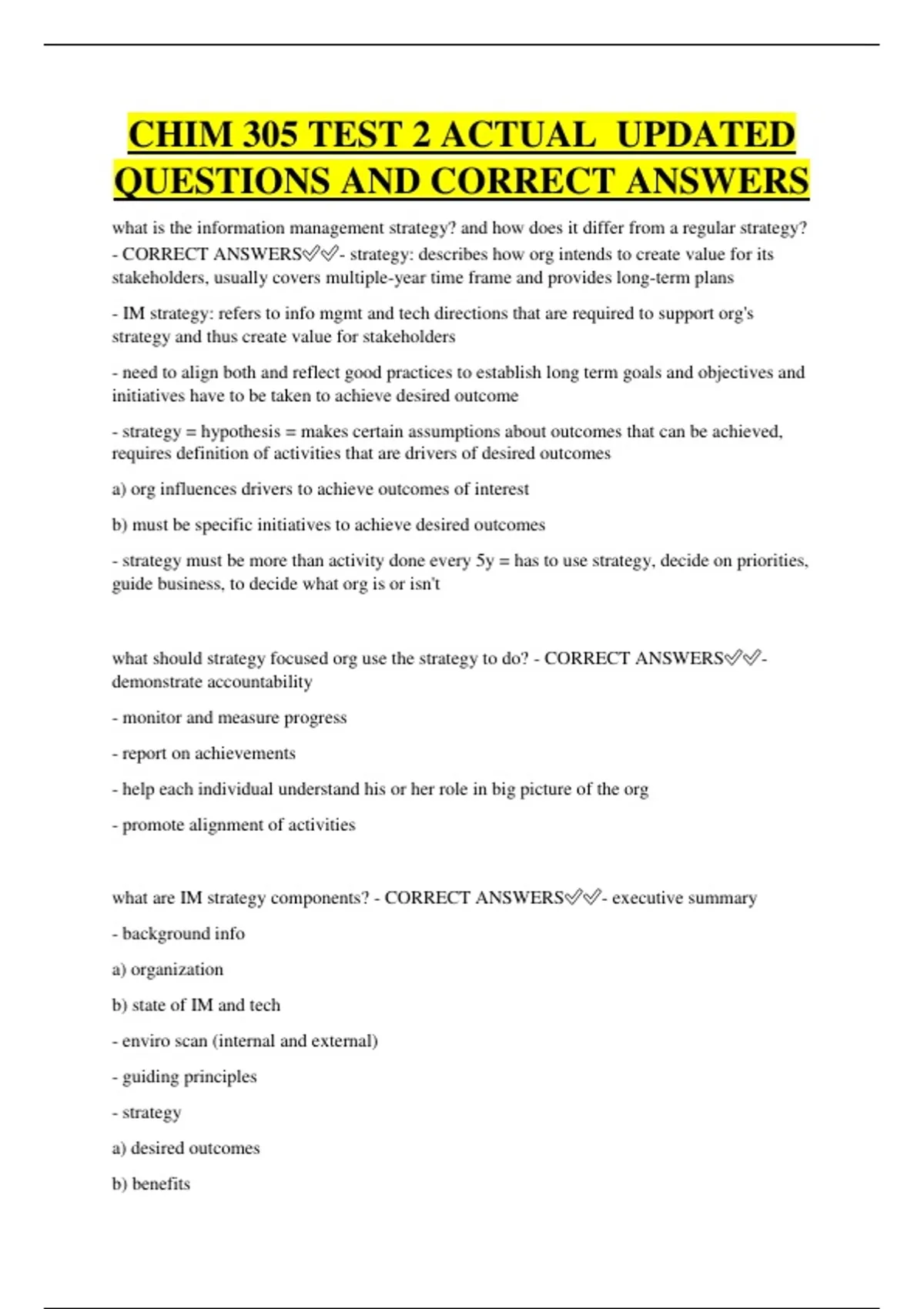 CHIM 305 TEST 2 ACTUAL UPDATED QUESTIONS AND CORRECT ANSWERS what is the information management strategy? and how does it differ from a regular strategy? - CORRECT ANSWERS- strategy: describes how org intends to create value for its stakeholders, usually covers multiple-year time frame and provides long-term plans - IM strategy: refers to info mgmt and tech directions that are required to support org's strategy and thus create value for stakeholders - need to align both and reflect good practices to establish long term goals and objectives and initiatives have to be taken to achieve desired outcome - strategy = hypothesis = makes certain assumptions about outcomes that can be achieved, requires definition of activities that are drivers of desired outcomes a) org influences drivers to achieve outcomes of interest b) must be specific initiatives to achieve desired outcomes - strategy must be more than activity done every 5y = has to use strategy, decide on priorities, guide business, to decide what org is or isn't what should strategy focused org use the strategy to do? - CORRECT ANSWERS- demonstrate accountability - monitor and measure progress - report on achievements - help each individual understand his or her role in big picture of the org - promote alignment of activities what are IM strategy components? - CORRECT ANSWERS- executive summary - background info a) organization b) state of IM and tech - enviro scan (internal and external) - guiding principles - strategy a) desired outcomes b) benefits c) assumptions - implementation plan and requirements - governance - measurement what is done to plan for an IS/IT purchase? - CORRECT ANSWERS- purchase/replacement/upgrade of info system or info tech is usually sig investment in many types of resources (dollar, people, education, time, equipment, space) - planning well, engagement of appropriate stakeholders, consultation, governance structures, appropriate tools, management and oversight are min requirements in planning stages what is the steering committee? - CORRECT ANSWERS- to oversee the process - multidisciplinary membership - consider all stakeholders with their needs and perspectives and knowledge - end users, managers, IT personnel, other what are planning steps for an IS purchase? - CORRECT ANSWERS- development of project work plan and timetable - oversight of systems analysis - identification of requirements - development of system specifications - determination of costs and benefits - compilation and distribution of RFP (request for proposal) - evaluation fo responses to RFP - selection of system - vendor negotiations - oversight of system implementation what are stakeholders expected to provide? - CORRECT ANSWERS- expertise: act as subject matter experts - balanced perspective: consider big picture, departmental, indivi