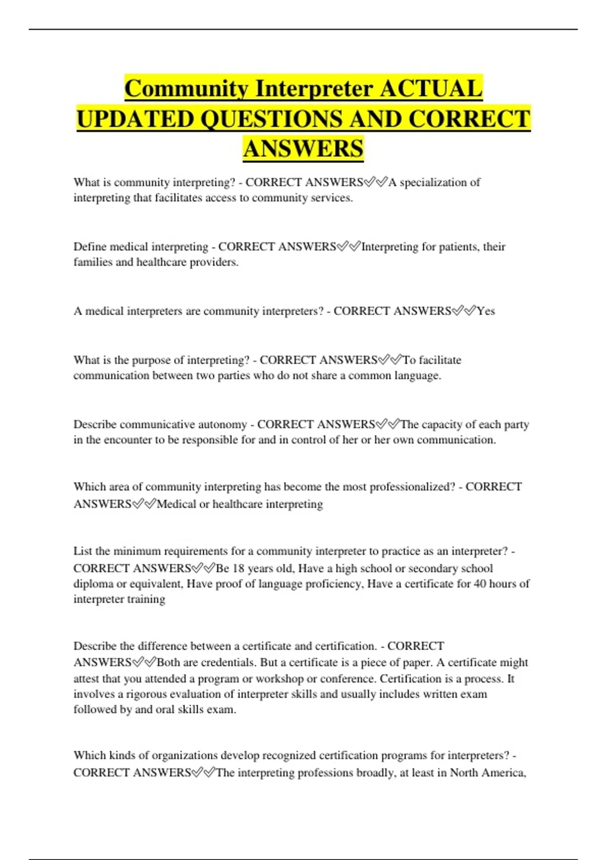 Community Interpreter ACTUAL UPDATED QUESTIONS AND CORRECT ANSWERS What is community interpreting? - CORRECT ANSWERSA specialization of interpreting that facilitates access to community services. Define medical interpreting - CORRECT ANSWERSInterpreting for patients, their families and healthcare providers. A medical interpreters are community interpreters? - CORRECT ANSWERSYes What is the purpose of interpreting? - CORRECT ANSWERSTo facilitate communication between two parties who do not share a common language. Describe communicative autonomy - CORRECT ANSWERSThe capacity of each party in the encounter to be responsible for and in control of her or her own communication. Which area of community interpreting has become the most professionalized? - CORRECT ANSWERSMedical or healthcare interpreting List the minimum requirements for a community interpreter to practice as an interpreter? - CORRECT ANSWERSBe 18 years old, Have a high school or secondary school diploma or equivalent, Have proof of language proficiency, Have a certificate for 40 hours of interpreter training Describe the difference between a certificate and certification. - CORRECT ANSWERSBoth are credentials. But a certificate is a piece of paper. A certificate might attest that you attended a program or workshop or conference. Certification is a process. It involves a rigorous evaluation of interpreter skills and usually includes written exam followed by and oral skills exam. Which kinds of organizations develop recognized certification programs for interpreters? - CORRECT ANSWERSThe interpreting professions broadly, at least in North America, recognize only those certification programs developed by federal or state/provincial governments and professional bodies. If you graduate successfully from a 40-hour interpreting program, are you certified? - CORRECT ANSWERSNo. You are professionally trained. If you have also been tested for language proficiency, you can refer to yourself as qualified. Name the organizations in the United States that provide national medical interpreter certification. - CORRECT ANSWERSCCHI (Certification for Healthcare In
