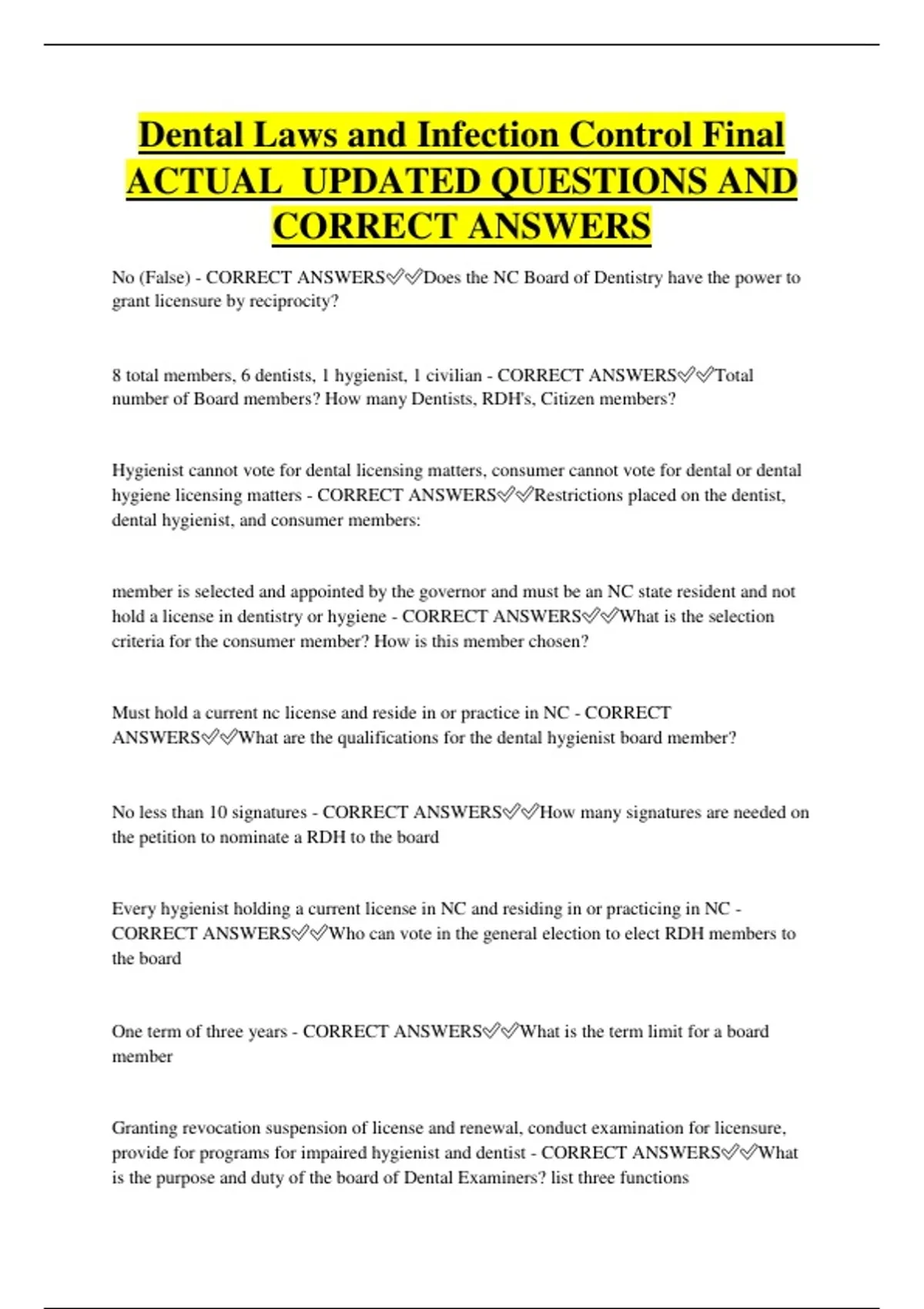 Dental Laws and Infection Control Final ACTUAL UPDATED QUESTIONS AND CORRECT ANSWERS No (False) - CORRECT ANSWERSDoes the NC Board of Dentistry have the power to grant licensure by reciprocity? 8 total members, 6 dentists, 1 hygienist, 1 civilian - CORRECT ANSWERSTotal number of Board members? How many Dentists, RDH's, Citizen members? Hygienist cannot vote for dental licensing matters, consumer cannot vote for dental or dental hygiene licensing matters - CORRECT ANSWERSRestrictions placed on the dentist, dental hygienist, and consumer members: member is selected and appointed by the governor and must be an NC state resident and not hold a license in dentistry or hygiene - CORRECT ANSWERSWhat is the selection criteria for the consumer member? How is this member chosen? Must hold a current nc license and reside in or practice in NC - CORRECT ANSWERSWhat are the qualifications for the dental hygienist board member? No less than 10 signatures - CORRECT ANSWERSHow many signatures are needed on the petition to nominate a RDH to the board Every hygienist holding a current license in NC and residing in or practicing in NC - CORRECT ANSWERSWho can vote in the general election to elect RDH members to the board One term of three years - CORRECT ANSWERSWhat is the term limit for a board member Granting revocation suspension of license and renewal, conduct examination for licensure, provide for programs for impaired hygienist and dentist - CORRECT ANSWERSWhat is the purpose and duty of the board of Dental Examiners? list three functions A majority of the members of said board - CORRECT ANSWERSWhat constitutes a quorum of the board The power to administer oaths and issue subpoenas - CORRECT ANSWERSName the judicial power granted to the board president and/or secretary-treasurer $100 per day - CORRECT ANSWERSCompensation / per diem for a board member is fixed by the board and not to exceed License shall at all times be displayed in a conspicuous place in the office of the holder, duplicate license is issued to holder upon receipt of application for duplicate and fee - CORRECT ANSWERSDescribe the criteria for the display of your license. What do you do if you work in more than one office? Any person who is licensed to practice hygiene anywhere in the US or in any country territory or other recognized jurisdiction, applicant may not have previously failed in examination conducted by the NC State Board of Dental