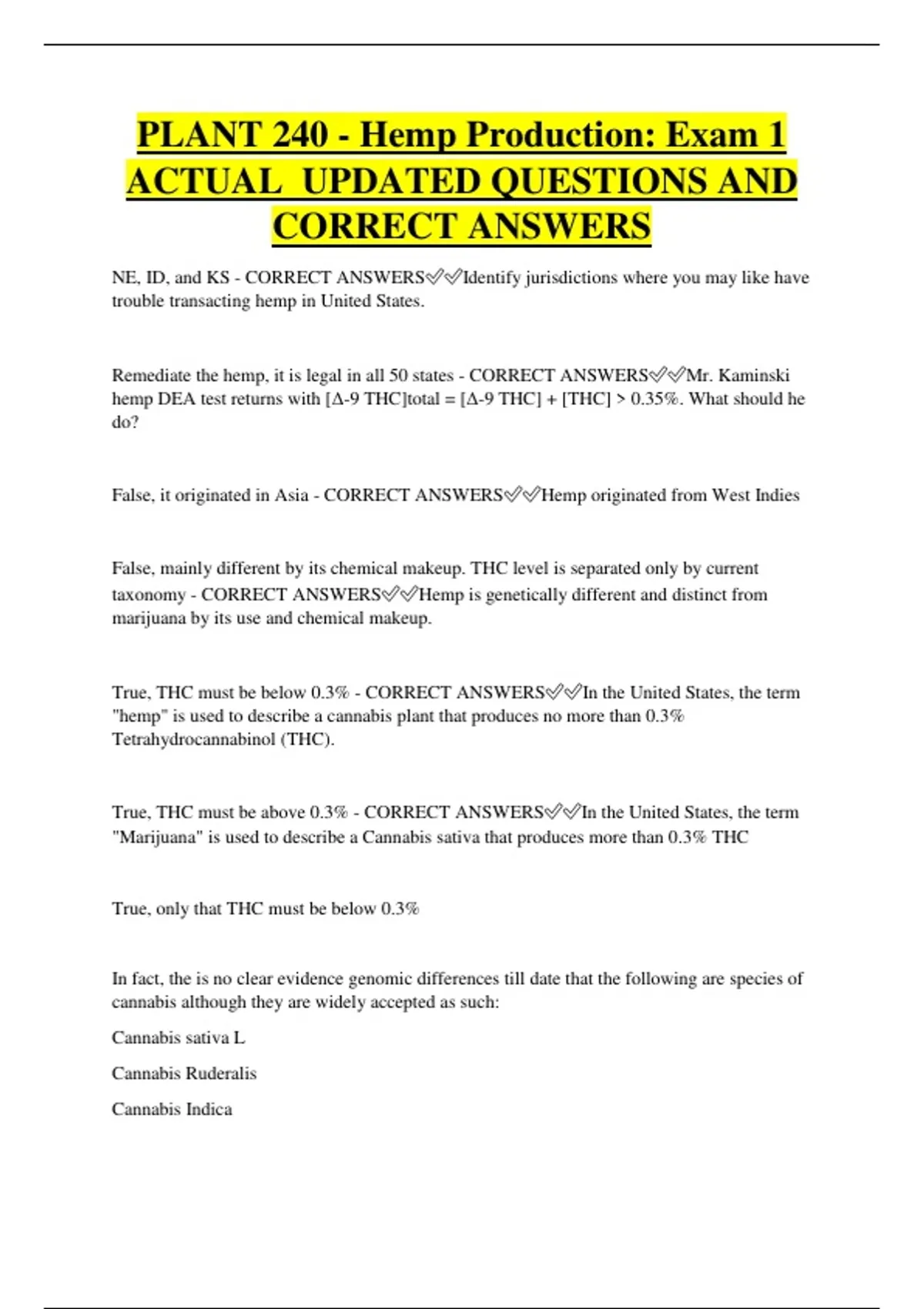 True, THC must be above 0.3% - CORRECT ANSWERS✅✅In the United States, the term