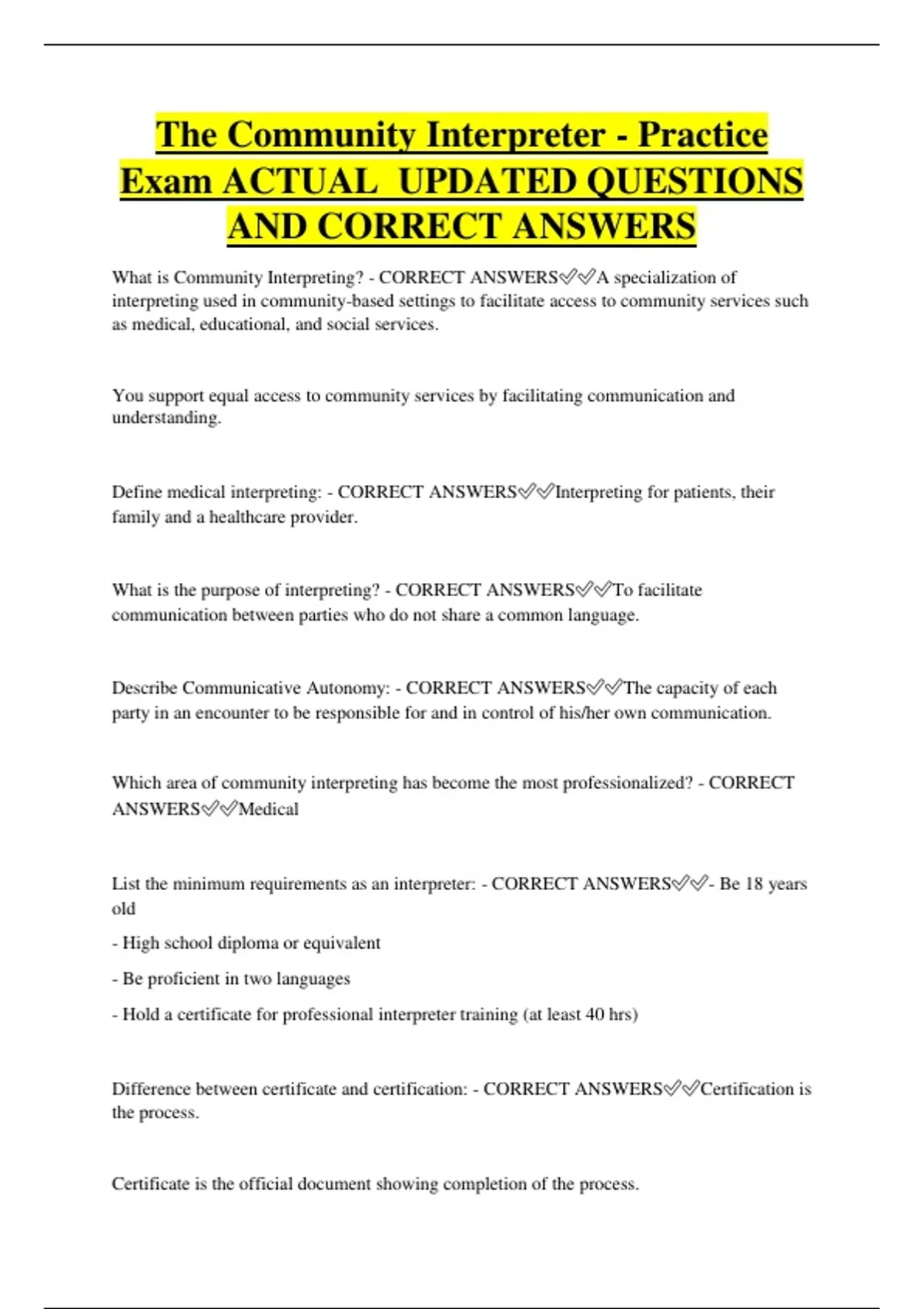 CORRECT ANSWERS✅✅CCHI- Certification Commission for Healthcare Interpreters