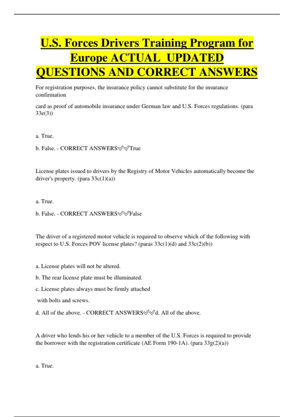U.S. Forces Drivers Training Program for Europe ACTUAL UPDATED QUESTIONS AND CORRECT ANSWERS For registration purposes, the insurance policy cannot substitute for the insurance confirmation card as proof of automobile insurance under German law and U.S. Forces regulations. (para 33e(3)) a. True. b. False. - CORRECT ANSWERSTrue License plates issued to drivers by the Registry of Motor Vehicles automatically become the driver's property. (para 33c(1)(a)) a. True. b. False. - CORRECT ANSWERSFalse The driver of a registered motor vehicle is required to observe which of the following with respect to U.S. Forces POV license plates? (paras 33c(1)(d) and 33c(2)(b)) a. License plates will not be altered. b. The rear license plate must be illuminated. c. License plates always must be firmly attached with bolts and screws. d. All of the above. - CORRECT ANSWERSd. All of the above. A driver who lends his or her vehicle to a member of the U.S. Forces is required to provide the borrower with the registration certificate (AE Form 190-1A). (para 33g(2)(a)) a. True. b. False. - CORRECT ANSWERSa. True. U.S. Forces regulations do not prohibit abandoning a privately owned vehicle (POV). (paras 33f(2) and 33h(5)) a. True. b. False. - CORRECT ANSWERSb. False. Attaching old State license plates or signs to U.S. Forces POV plates is