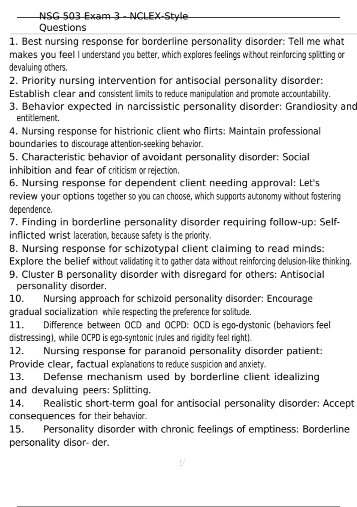 1. Best nursing response for borderline personality disorder: Tell me what