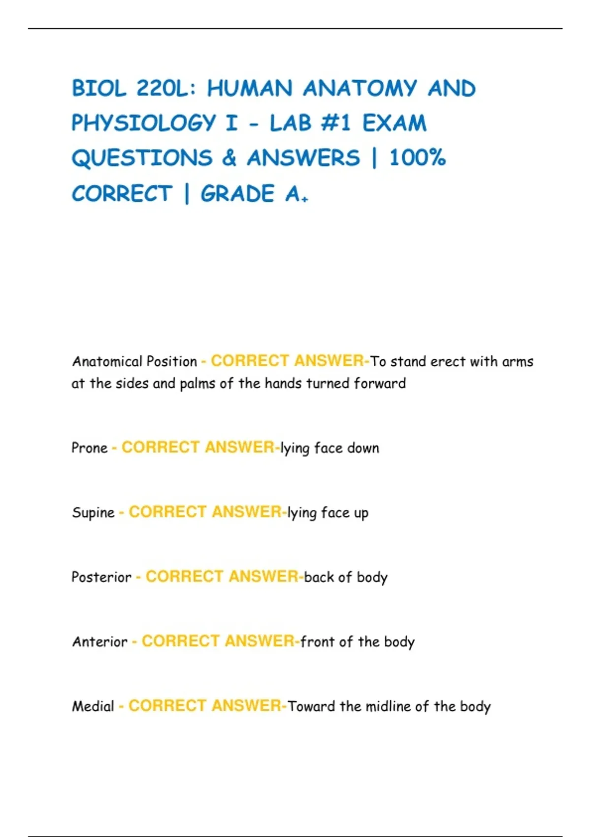 BIOL 220L: HUMAN ANATOMY AND PHYSIOLOGY I - LAB #1 EXAM QUESTIONS & ANSWERS | 100% CORRECT | GRADE A+