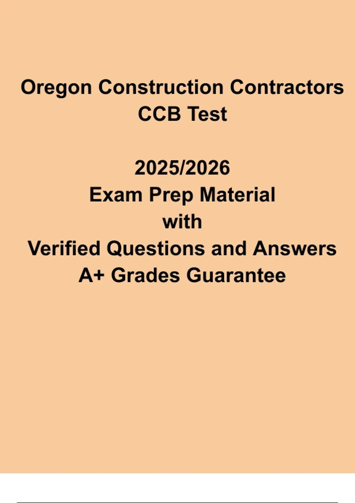 Prepare effectively for the Oregon Construction Contractors CCB Test with this expert-verified 2025/2026 study guide. This resource includes verified practice questions, detailed answers, and comprehensive coverage of construction laws, licensing requirements, safety regulations, and project management principles. Perfect for aspiring contractors, this Oregon CCB Exam Study Pack provides structured exam practice, reinforces essential knowledge, and equips candidates with the confidence needed to pass the licensing test successfully.