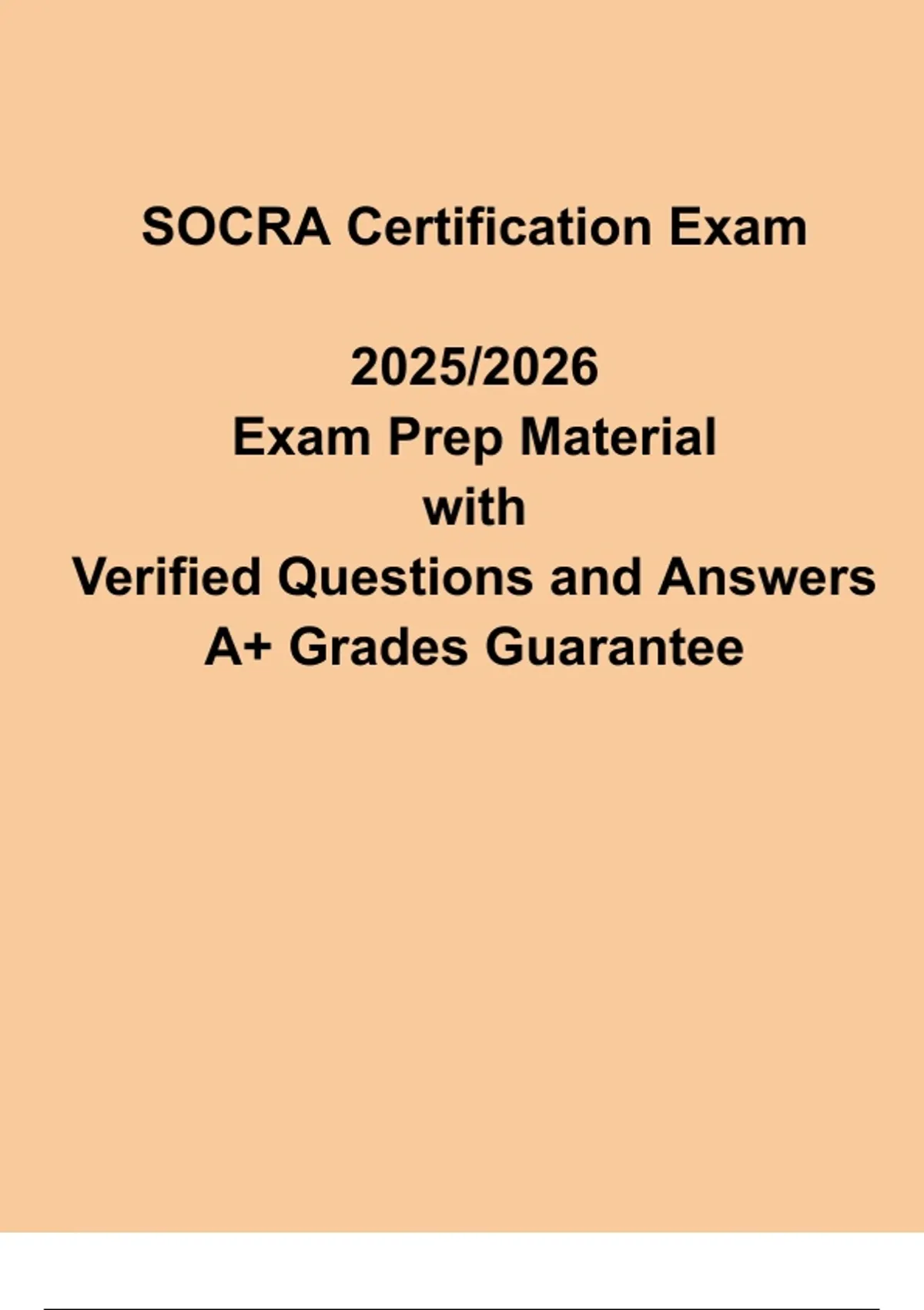 Prepare effectively for the SOCRA Certification Exam with this expert-verified 2025/2026 study guide. This comprehensive resource includes verified practice questions, detailed answers, and full coverage of clinical research principles, regulatory compliance, study management, and ethical considerations. Ideal for clinical research professionals seeking SOCRA certification, this study pack provides structured exam practice, reinforces essential knowledge, and equips candidates with the confidence needed to pass the certification exam successfully.