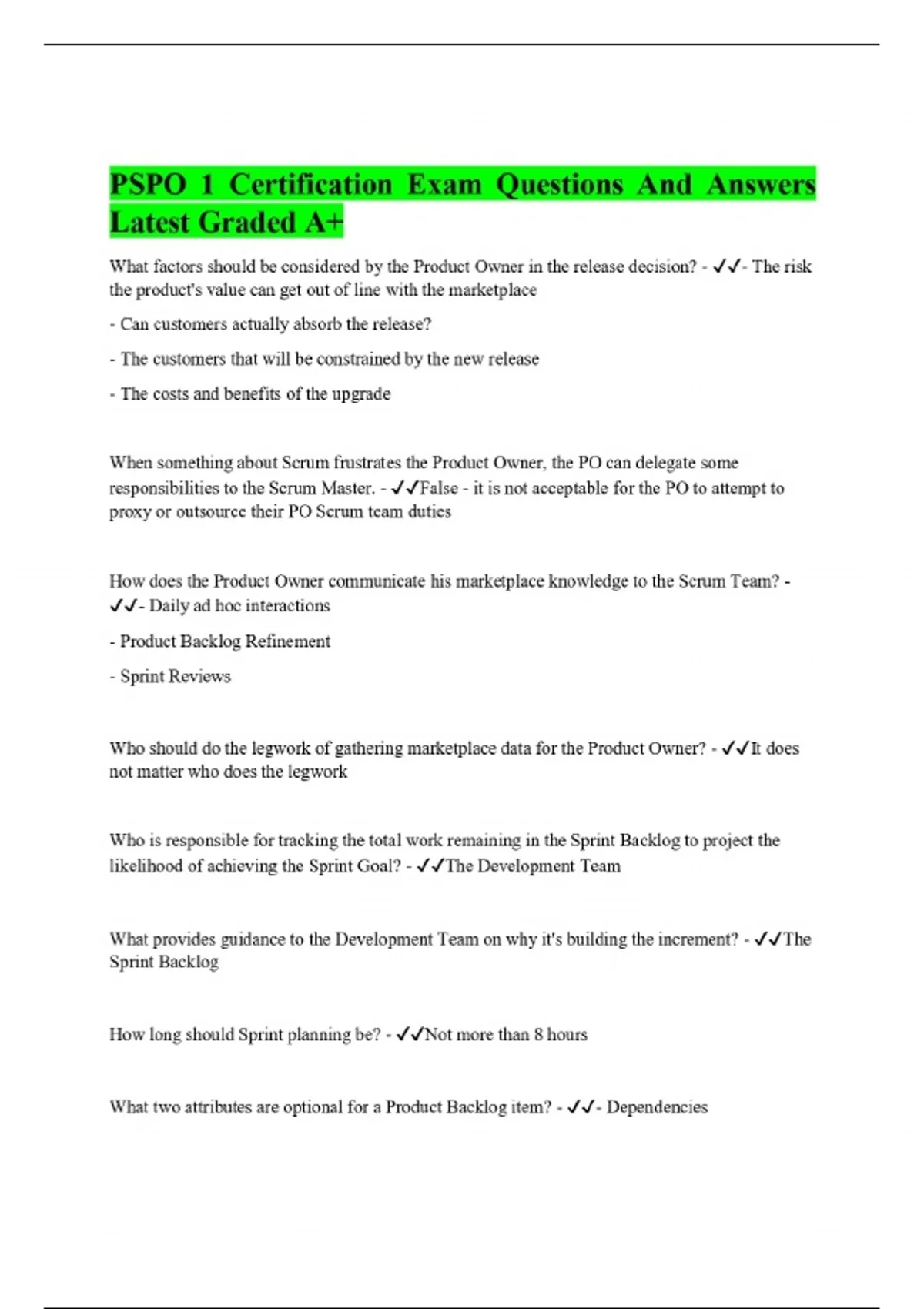 PSPO 1 Certification Exam Questions And Answers Latest Graded A+