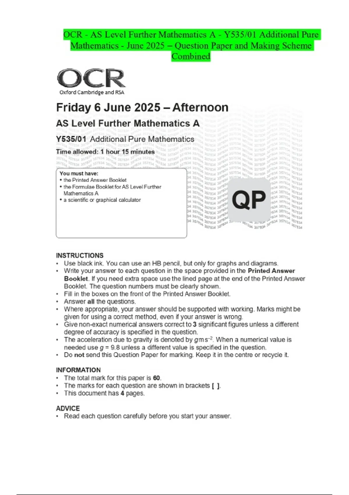 OCR - AS Level Further Mathematics A - Y535/01 Additional Pure Mathematics - June 2025 - Question Paper and Making Scheme Combined