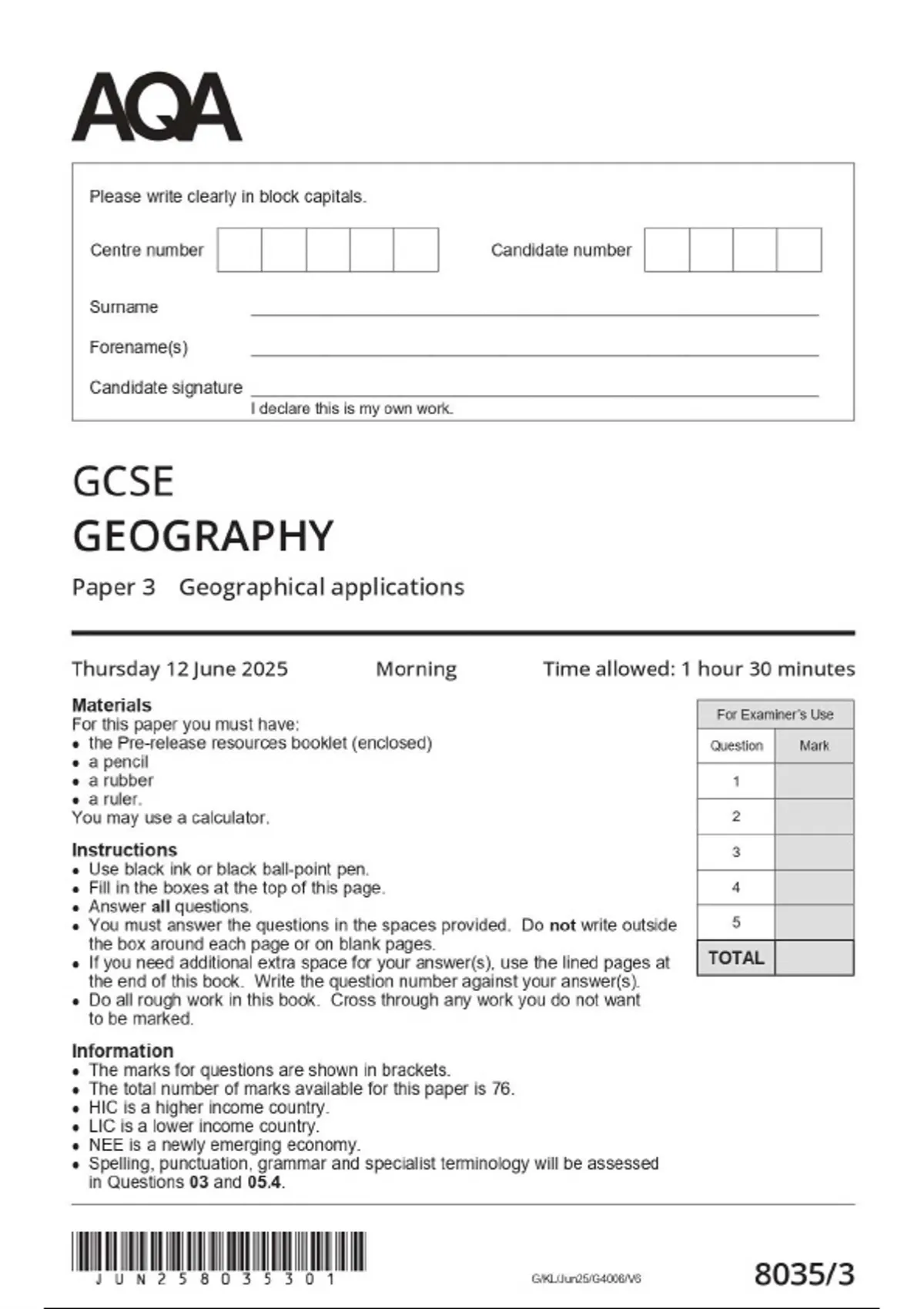 AQA GCSE GEOGRAPHY 2025 PAPER 3 QUESTION PAPER