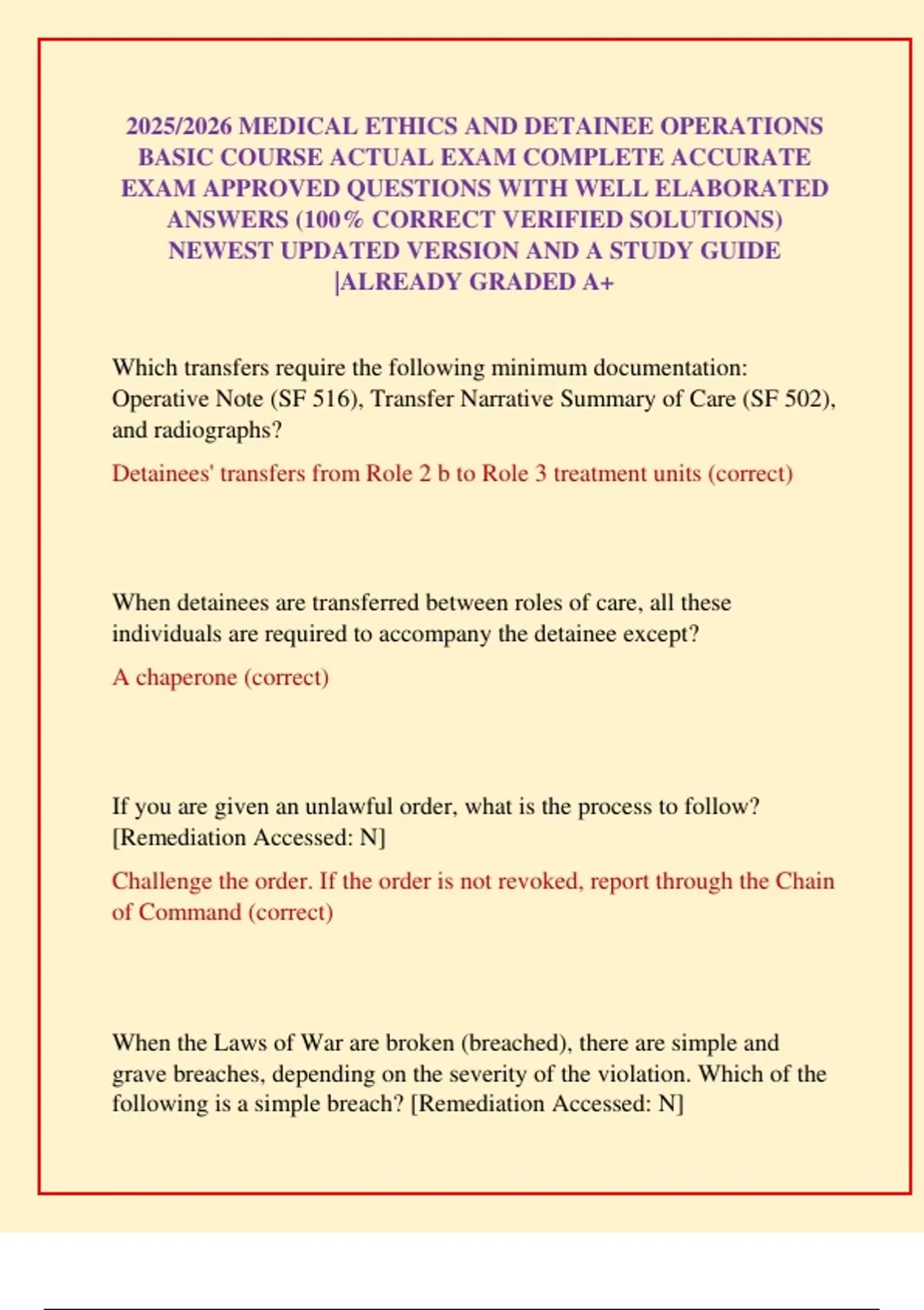2025/2026 MEDICAL ETHICS AND DETAINEE OPERATIONS BASIC COURSE ACTUAL EXAM COMPLETE ACCURATE EXAM APPROVED QUESTIONS WITH WELL ELABORATED ANSWERS (100% CORRECT VERIFIED SOLUTIONS) NEWEST UPDATED VERSION AND A STUDY GUIDE |ALREADY GRADED A+