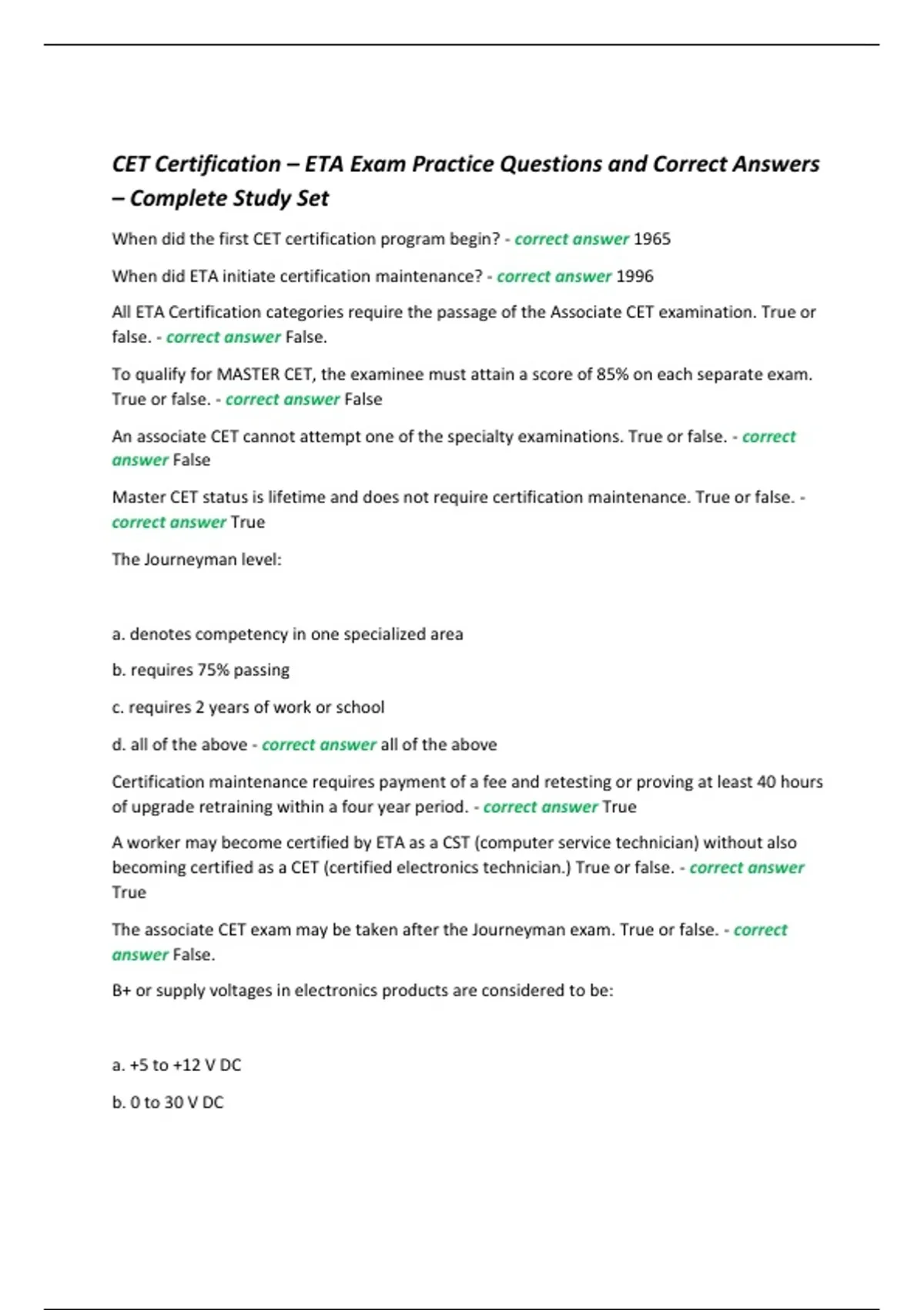 When did the first CET certification program begin? - correct answer 1965 When did ETA initiate certification maintenance? - correct answer 1996 All ETA Certification categories require the passage of the Associate CET examination. True or false. - correct answer False. To qualify for MASTER CET, the examinee must attain a score of 85% on each separate exam. True or false. - correct answer False An associate CET cannot attempt one of the specialty examinations. True or false. - correct answer False Master CET status is lifetime and does not require certification maintenance. True or false. - correct answer True The Journeyman level: a. denotes competency in one specialized area b. requires 75% passing