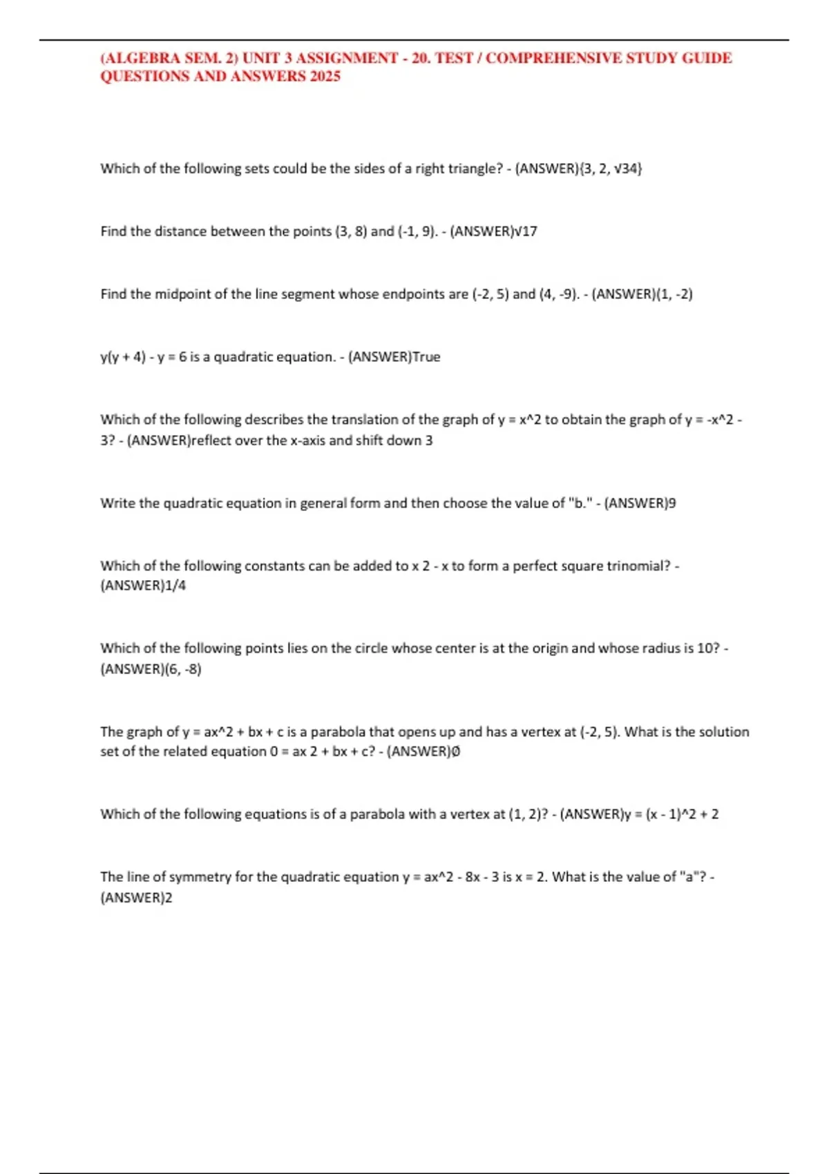 (ALGEBRA SEM. 2) UNIT 3 ASSIGNMENT - 20. TEST / COMPREHENSIVE STUDY GUIDE