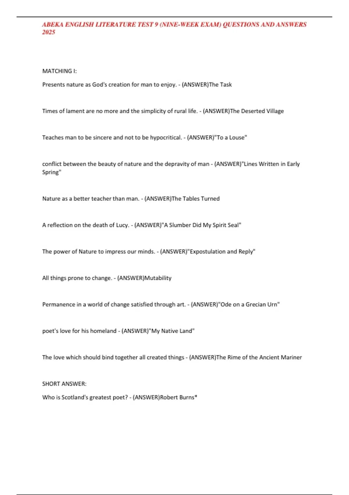ABEKA ENGLISH LITERATURE TEST 9 (NINE-WEEK EXAM) QUESTIONS AND ANSWERS