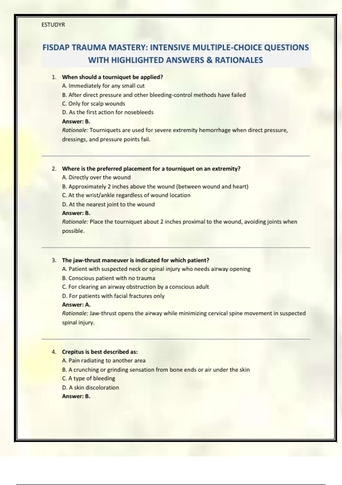 FISDAP TRAUMA MASTERY: INTENSIVE MULTIPLE-CHOICE QUESTIONS