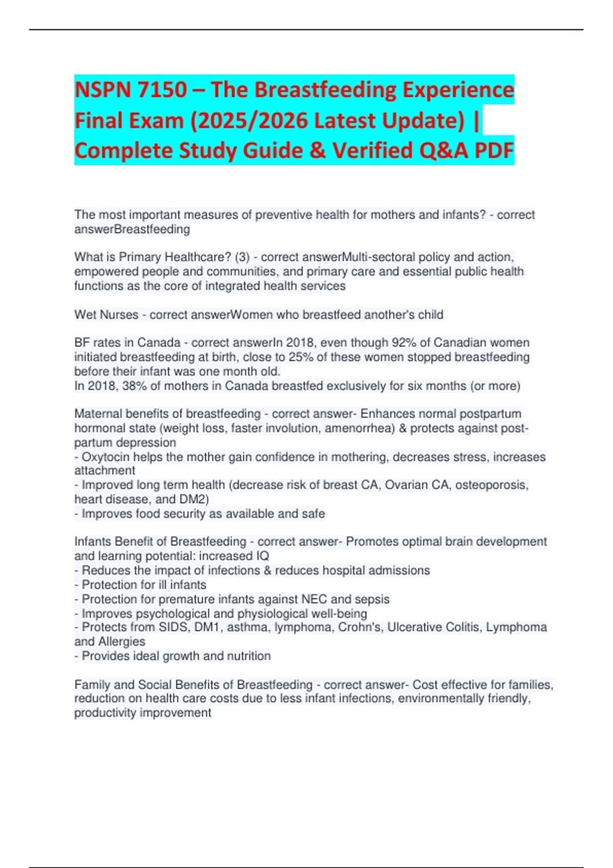 Prepare confidently for the NSPN 7150 – The Breastfeeding Experience Final Exam with this fully updated 2025/2026 study guide and verified Q&A PDF. This comprehensive resource covers all key breastfeeding concepts, maternal–infant health principles, lactation physiology, best clinical practices, and the most commonly tested exam questions. Designed for nursing students and professionals, this guide ensures accurate, current, and exam-ready content to help you achieve top results on your final assessment.