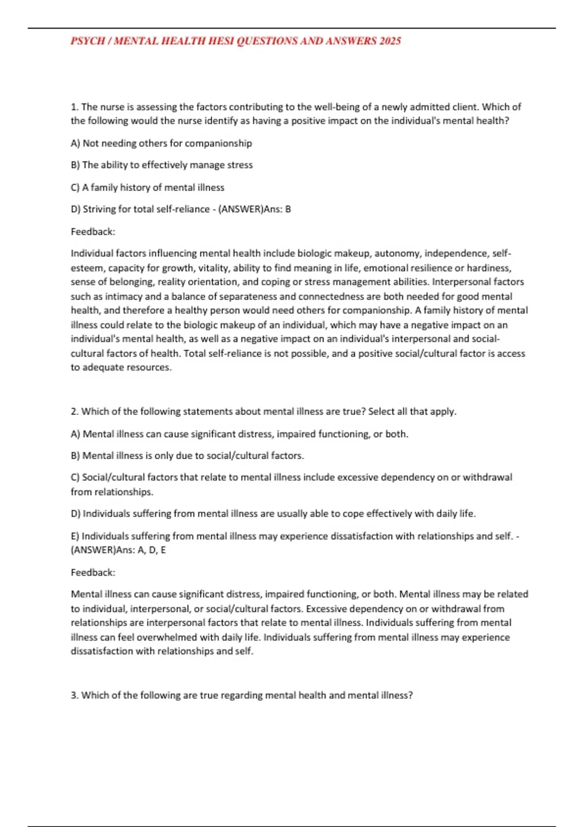 PSYCH / MENTAL HEALTH HESI QUESTIONS AND ANSWERS 2025