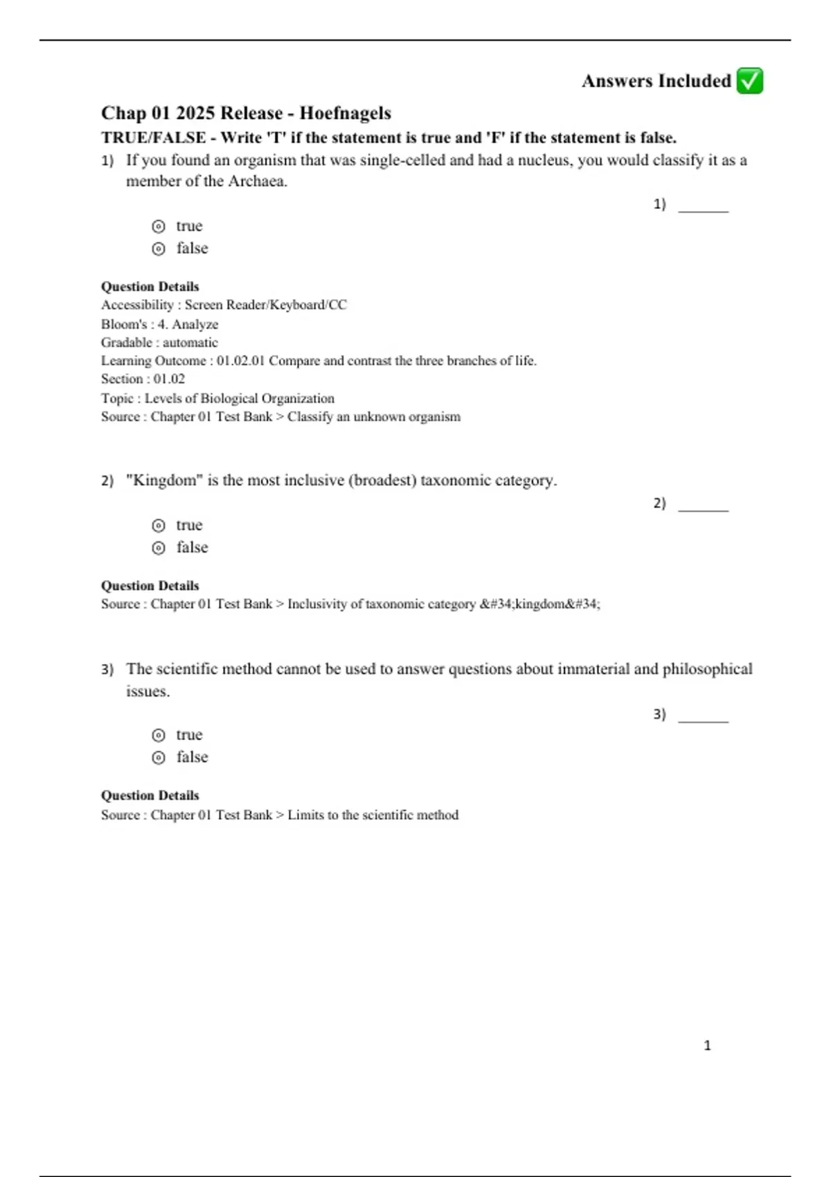 Source : Chapter 01 Test Bank > Inclusivity of taxonomic category "kingdom"
