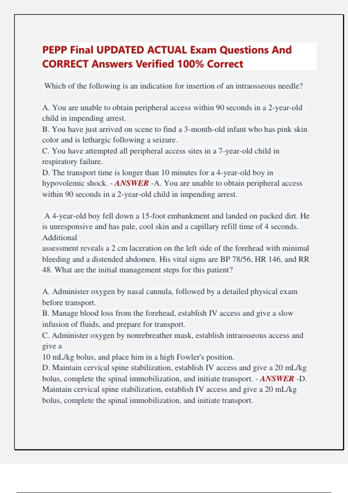 PEPP Final UPDATED ACTUAL Exam Questions And CORRECT Answers Verified 100% Correct Which of the following is an indication for insertion of an intraosseous needle? A. You are unable to obtain peripheral access within 90 seconds in a 2-year-old child in impending arrest. B. You have just arrived on scene to find a 3-month-old infant who has pink skin color and is lethargic following a seizure. C. You have attempted all peripheral access sites in a 7-year-old child in respiratory failure. D. The transport time is longer than 10 minutes for a 4-year-old boy in hypovolemic shock. - ANSWER -A. You are unable to obtain peripheral access within 90 seconds in a 2-year-old child in impending arrest. A 4-year-old boy fell down a 15-foot embankment and landed on packed dirt. He is unresponsive and has pale, cool skin and a capillary refill time of 4 seconds. Additional assessment reveals a 2 cm laceration on the left side of the forehead with minimal bleeding and a distended abdomen. His vital signs are BP 78/56, HR 146, and RR 48. What are the initial management steps for this patient? A. Administer oxygen by nasal cannula, followed by a detailed physical exam before transport. B. Manage blood loss from the forehead, establish IV access and give a slow infusion of fluids, and prepare for transport. C. Administer oxygen by nonrebreather mask, establish intraosseous access and give a 10 mL/kg bolus, and place him in a high Fowler's position. D. Maintain cervical spine stabilization, establish IV access and give a 20 mL/kg bolus, complete the spinal immobilization, and initiate transport. - ANSWER -D. Maintain cervical spine stabilization, establish IV access and give a 20 mL/kg bolus, complete the spinal immobilization, and initiate transport. What is the dysrhythmia for a 3-year-old with a heart rate of 180 beats/min, a narrow QRS complex, and a variable R-R interval called? A. Supraventricular tachycardia. B. Sinus tachycardia. C. Ventricular tachycardia. D. Pulseless electrical activity (PEA). - ANSWER -B. Sinus tachycardia. What is the initial airway management of a child who is seizing and has gurgling respirations? A. Suction the oropharynx. B. Insert an endotracheal tube. C. Insert an oropharyngeal airway. D. Administer bag-mask ventilation. - ANSWER -A. Suction the oropharynx. A 3-year-old boy reportedly fell down a flight of stairs and has a swollen, deformed right forearm. You also note several small, healing, circular burns on his arms and back. He appears quiet and withdrawn. What is the treatment of this patient? A. Splint the forearm. B. Establish IV access. C. Cover the burns. D. Contact law enforcement. - ANSWER -A. Splint the forearm. What is the best way to repair a break in a central line catheter? A. Place a piece of silk tape horizontally over the break. B. Remove the catheter. C. Irrigate the catheter. D. Clamp the catheter with a hemostat and gauze. - ANSWER -D. Clamp the catheter with a hemostat and gauze. What is a contraindication to straightening the head and neck of a trauma patient during spinal immobilization? A. Resistance to movement. B. Multiple facial injuries. C. Dilated pupils. D. Severe headache. - ANSWER -A. Resistance to movement. A 4-year-old semi-responsive boy has had difficulty breathing and a fever for 3 days. Vital signs are BP 60/40, HR 128, and RR 10. What initial management should be performed? A. Open the airway and maintain cervical spine immobilization. B. Open the airway and ventilate with a bag-mask device. C. Place the patient in the Trendelenburg position. D. Apply oxygen by nonrebreather mask at 15 L/min. - ANSWER -B. Open the airway and ventilate with a bag-mask device. A 12-year-old boy was shot in the abdomen during a hunting accident. He has altered mental status and his skin is cool and clammy. Vital signs are BP 64/46, weak HR 142, and RR 38. What do the signs and symptoms suggest? A. Tension pneumothorax. B. Neurogenic shock. C. Cardiac tamponade. D. Hypovolemic shock. - ANSWER -D. Hypovolemic shock. What is the priority treatment for a child with altered mental status? A. Open the airway. B. Obtain a history. C. Protect the cervical spine. D. Obtain a blood glucose. - ANSWER -A. Open the airway.