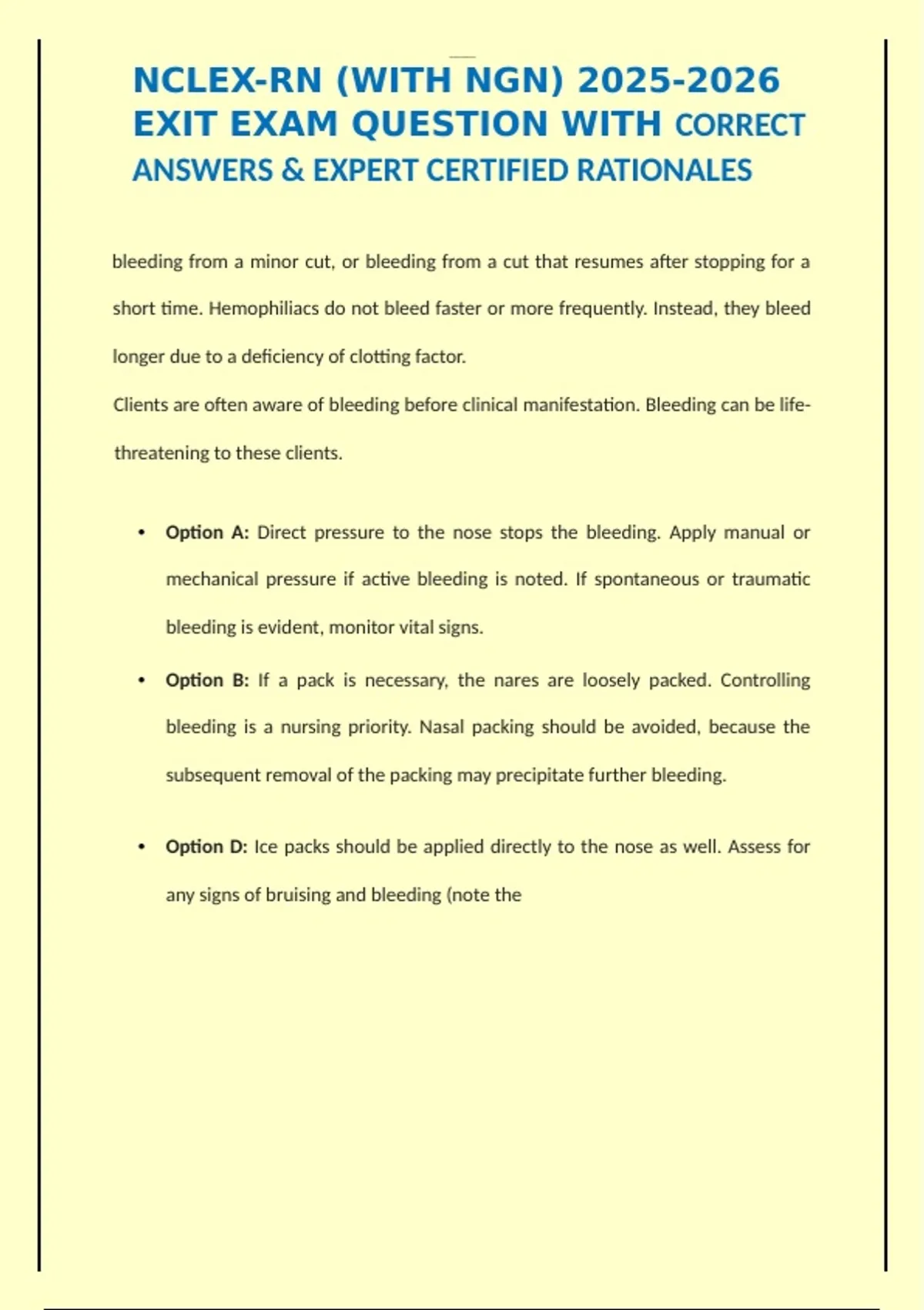NCLEX-RN (WITH NGN) EXIT EXAM QUESTION WITH CORRECT ANSWERS & EXPERT CERTIFIED RATIONALES bleeding from a minor cut, or bleeding from a cut that resumes after stopping for a short time. Hemophiliacs do not bleed faster or more frequently. Instead, they bleed longer due to a deficiency of clotting factor. Clients are often aware of bleeding before clinical manifestation. Bleeding can be life-threatening to these clients. • Option A: Direct pressure to the nose stops the bleeding. Apply manual or mechanical pressure if active bleeding is noted. If spontaneous or traumatic bleeding is evident, monitor vital signs. • Option B: If a pack is necessary, the nares are loosely packed. Controlling bleeding is a nursing priority. Nasal packing should be avoided, because the subsequent removal of the packing may precipitate further bleeding. • Option D: Ice packs should be applied directly to the nose as well. Assess for any signs of bruising and bleeding (note the extent of bleeding). Assess for prolonged bleeding after minor injuries. NCLEXRN-08-001 Question Tag: unilateral adrenalectomy Question Category: Physiological Integrity A client has had a unilateral adrenalectomy to remove a tumor. To prevent complications, the most important measurement in the immediate postoperative period for the nurse to take is: • A. Blood pressure • B. Temperature • C. Output • D. Specific gravity Correct Answer: A. Blood pressure Blood pressure is the best indicator of cardiovascular collapse in the client who has had an adrenal gland removed. The remaining gland might have been suppressed due to the tumor activity. Primary adrenal insufficiency occurs after bilateral adrenalectomy. Signs and symptoms are volume depletion, hypotension, hyponatremia, hyperkalemia, fever, abdominal pain. Patients are managed by replacement therapy based on glucocorticoids (hydrocortisone or cortisone), mineralocorticoids (fludrocortisone) in cases of confirmed corticoids or aldosterone deficiency, respectively. • Option B: Temperature would be an indicator of infection. Patients in the adrenal crisis typically present with profoundly impaired well-being, hypotension, nausea and vomiting, and fever responding well to parenteral hydrocortisone administration. Infections are the major precipitating causes of adrenal crisis. • Option C: Decreased output would be a clinical manifestation but would take longer to occur than blood pressure changes. The clinician must be able to work-up and manage patients with adrenal masses, both functional and non-functional, to treat these patients with minimal morbidity. When planning for adrenalectomy, considerations of hormonal changes and preoperative preparation for these changes is as important and demands as much of the surgeon’s attention as the technical aspects of the case. • Option D: Specific gravity changes occur with other disorders. Adrenalectomy has been shown to have a relatively low risk of postoperative complications, with an overall rate of 3.6%. Improved patient outcomes and decreased hospital costs have been demonstrated when adrenalectomy is performed by a high-volume adrenal surgeon (>/=6 adrenalectomies/year). NCLEXRN-08-002 Question Tag: Addison’s disease, glucocorticoids Question Category: Physiological Integrity A client with Addison’s disease has been admitted with a history of nausea and vomiting for the past 3 days. The client is receiving IV glucocorticoids (Solu-Medrol). Which of the following interventions would the nurse implement? • A. Daily weights • B. Intake/output measurements • C. Sodium and potassium levels monitored • D. Glucometer readings as ordered Correct Answer: D. Glucometer readings as ordered IV glucocorticoids raise the glucose levels and often require coverage with insulin. Cortisone and prednisone replace cortisol deficits, which will promote sodium reabsorption. Fludrocortisone is a mineralocorticoid for patients who require aldosterone replacement to promote sodium and water replacement. Acute adrenal insufficiency is a medical emergency requiring immediate fluid and corticosteroid administration. If treated for adrenal crisis, the patient requires IV hydrocortisone
