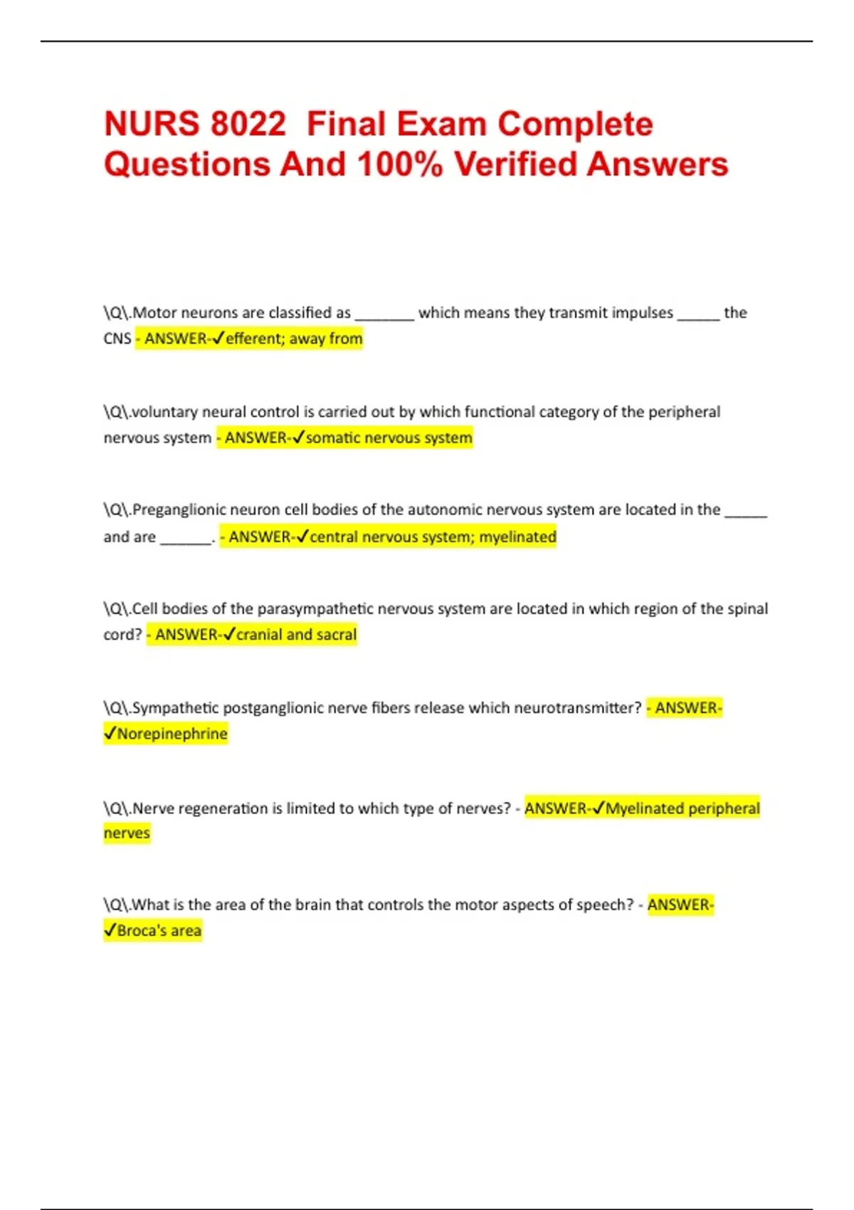 NURS 8022 Final Exam Complete Questions And 100% Verified Answers Q.Motor neurons are classified as _______ which means they transmit impulses _____ the CNS - ANSWER-efferent; away from Q.voluntary neural control is carried out by which functional category of the peripheral nervous system - ANSWER-somatic nervous system Q.Preganglionic neuron cell bodies of the autonomic nervous system are located in the _____ and are ______. - ANSWER-central nervous system; myelinated Q.Cell bodies of the parasympathetic nervous system are located in which region of the spinal cord? - ANSWER-cranial and sacral Q.Sympathetic postganglionic nerve fibers release which neurotransmitter? - ANSWER-Norepinephrine Q.Nerve regeneration is limited to which type of nerves? - ANSWER-Myelinated peripheral nerves Q.What is the area of the brain that controls the motor aspects of speech? - ANSWER-Broca's area Q.The area of the brain that is responsible for maintaining balance and coordination is the ____. - ANSWER-Cerebellum Q.The posterior horn of the spinal cord is primarily composed of ___________ neurons. - ANSWER-Sensory Q.If there is an injury to the spinothalamic tract of the spinal cord, what will you find on the exam? - ANSWER-Contralateral loss of pain and temperature Q.Upper motor neurons are located where? - ANSWER-CNS Q.Which cranial nerve would you be most concerned about if on examination you found that the patient was unable to abduct their left eye? - ANSWER-Abducens Q.Arterial supply to the meninges is in which dural space? - ANSWER-Epidural space Q.What is the main regulator of cerebral blood flow? - ANSWER-Carbon dioxide levels Q.A major difference between delirium and dementia is that dementia _______. - ANSWER-is related to degeneration of nerve cells