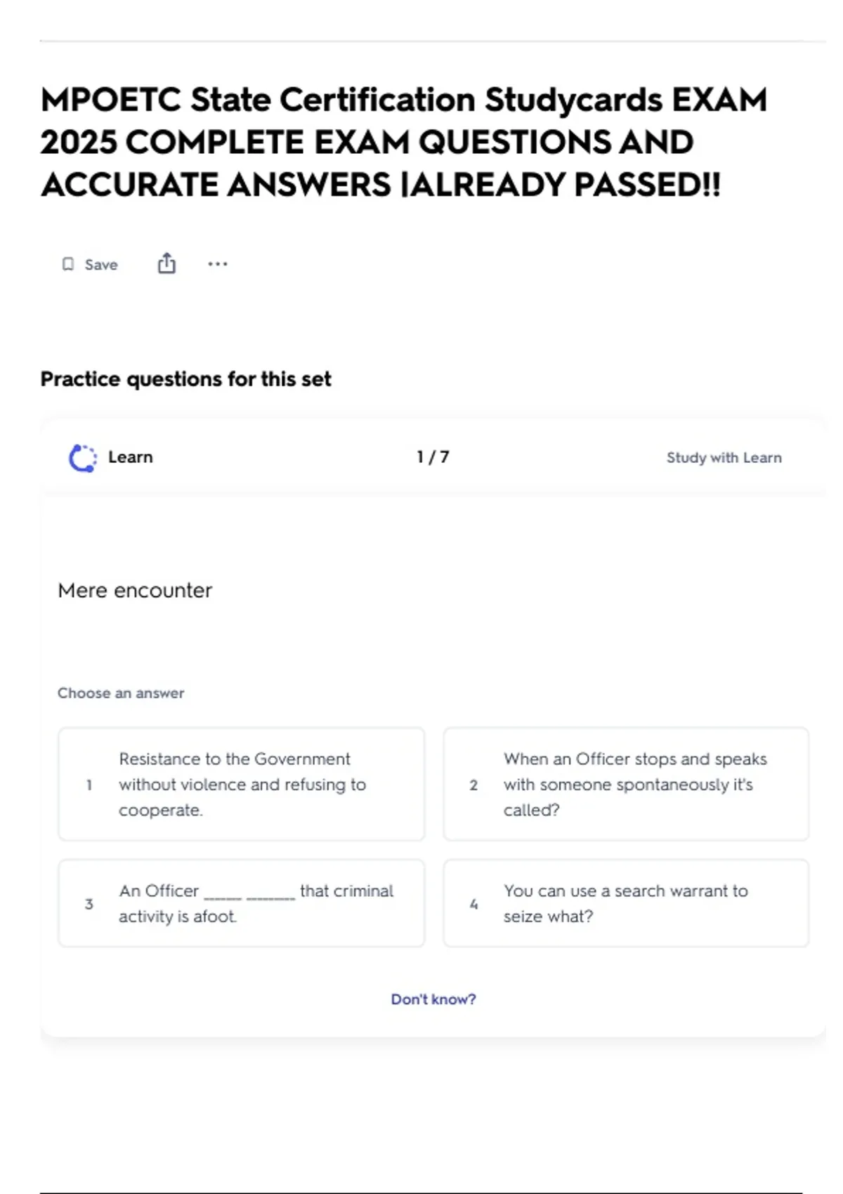 MPOETC State Certification Studycards EXAM 2025 COMPLETE EXAM QUESTIONS AND ACCURATE ANSWERS |ALREADY PASSED!!