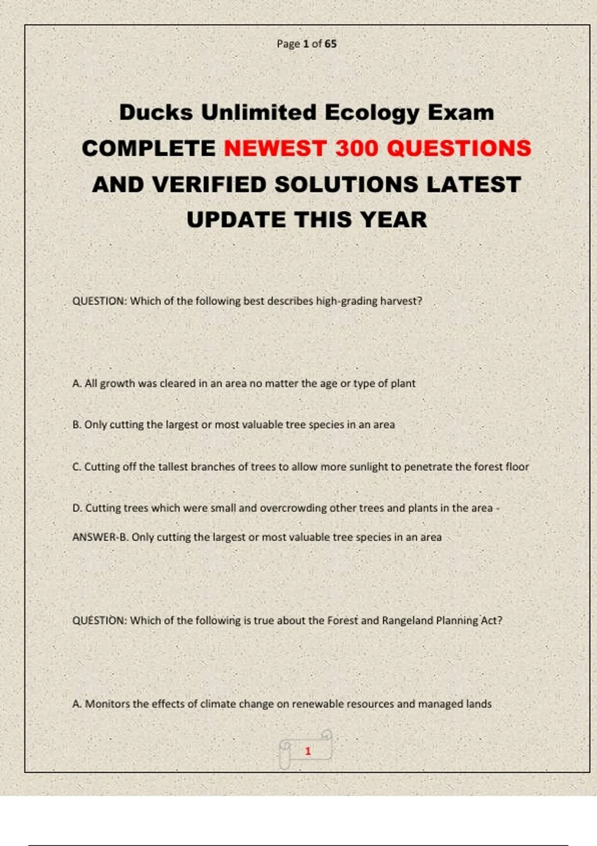 Ducks Unlimited Ecology Exam COMPLETE NEWEST 300 QUESTIONS AND VERIFIED SOLUTIONS LATEST UPDATE THIS YEAR