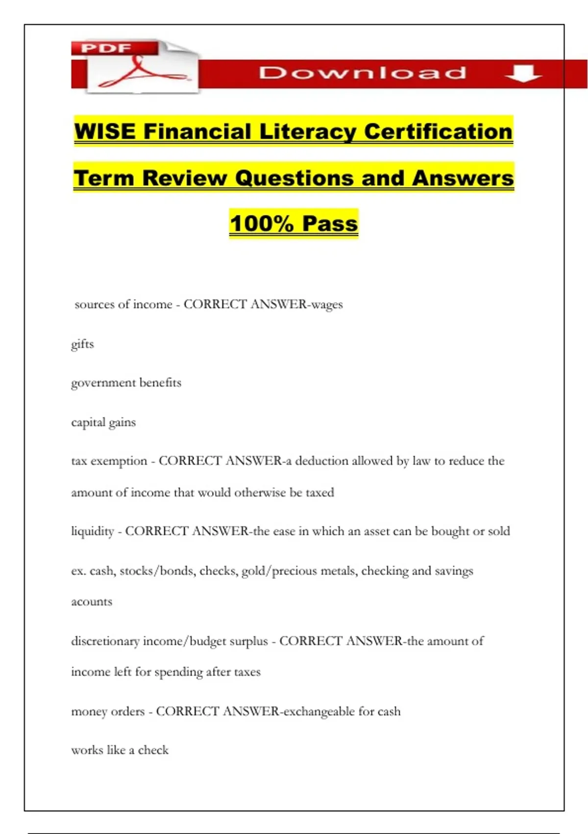WISE Financial Literacy Certification Term Review Questions and Answers 100% Pass