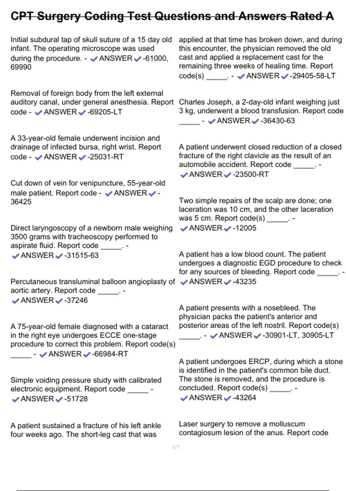 , CPT Surgery Coding Test Questions and Answers Rated A