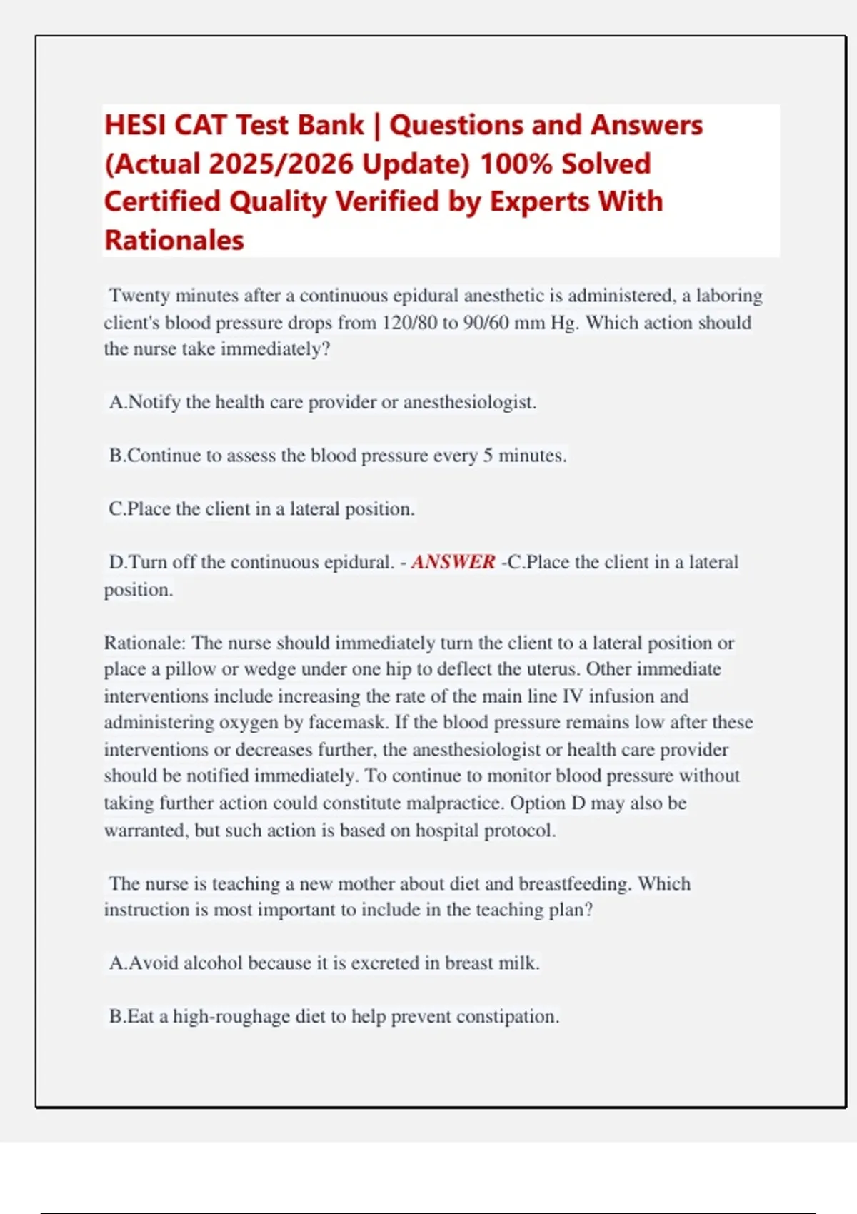 D.Turn off the continuous epidural. - ANSWER -C.Place the client in a lateral