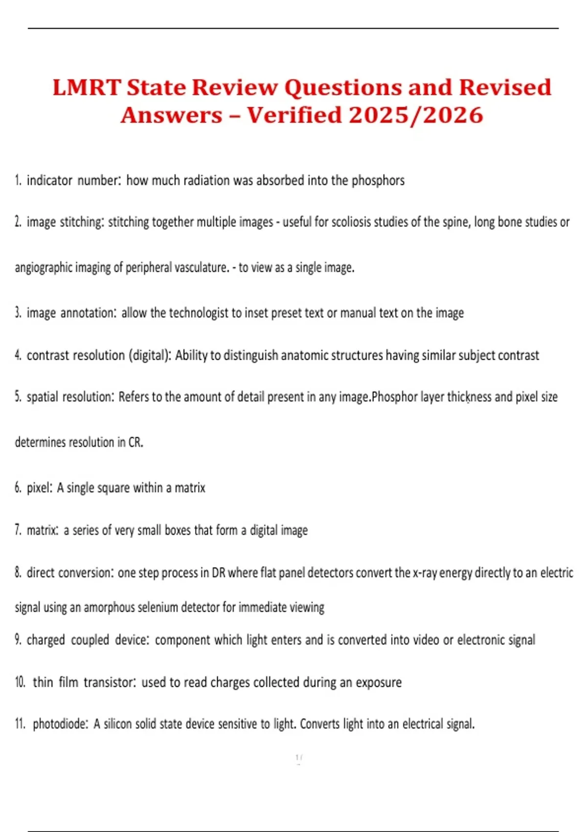 This LMRT (Limited Medical Radiologic Technologist) state review guide for 2025/2026 provides a complete set of updated review questions with fully revised and verified answers. It covers essential radiologic practice topics such as radiation safety, imaging procedures, patient positioning, equipment operation, and regulatory standards. Designed to reflect the latest state exam expectations, this resource helps candidates reinforce foundational knowledge and prepare effectively for LMRT certification.