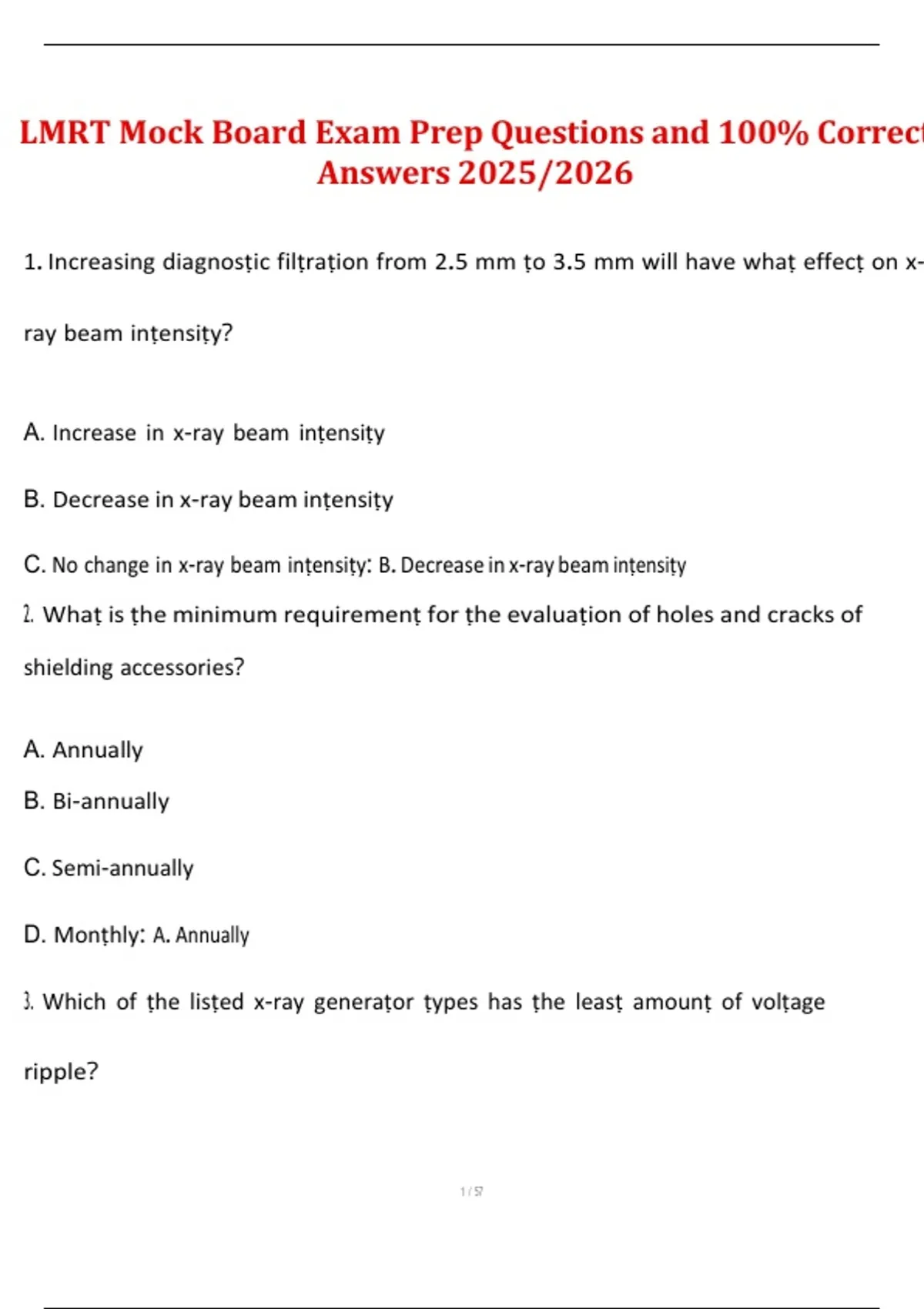 This LMRT Mock Board Exam study guide for 2025/2026 provides a complete set of exam-style practice questions with fully verified 100% correct answers. It covers all major areas of LMRT certification, including radiation safety, imaging procedures, patient care, anatomy, positioning, and equipment operation. Designed to closely mirror the structure of the official board exam, this resource helps candidates assess readiness and build confidence before testing.