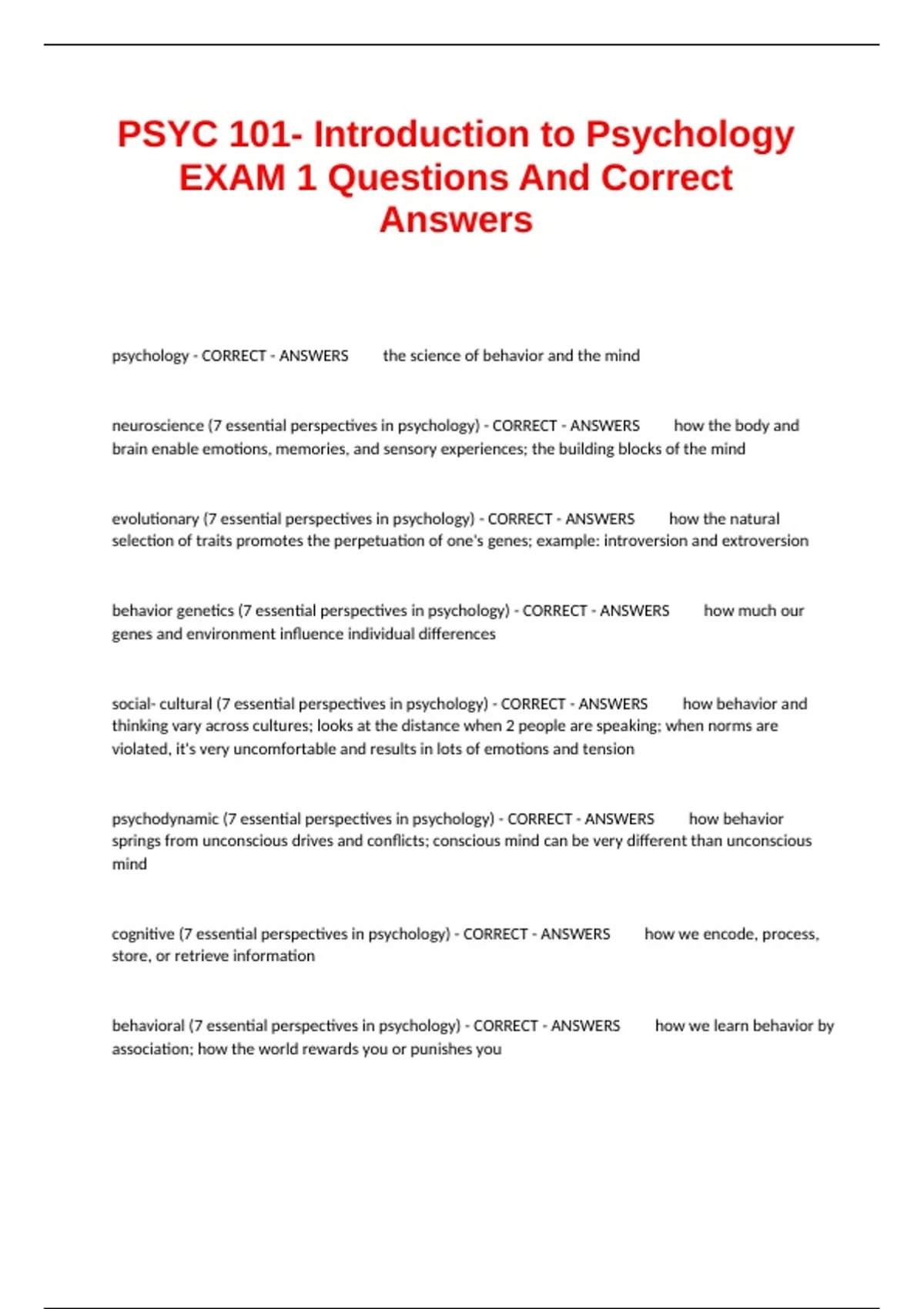 psychology - CORRECT - ANSWERS the science of behavior and the mind