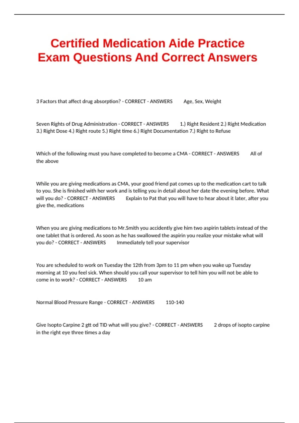 Certified Medication Aide Practice Exam Questions And Correct Answers