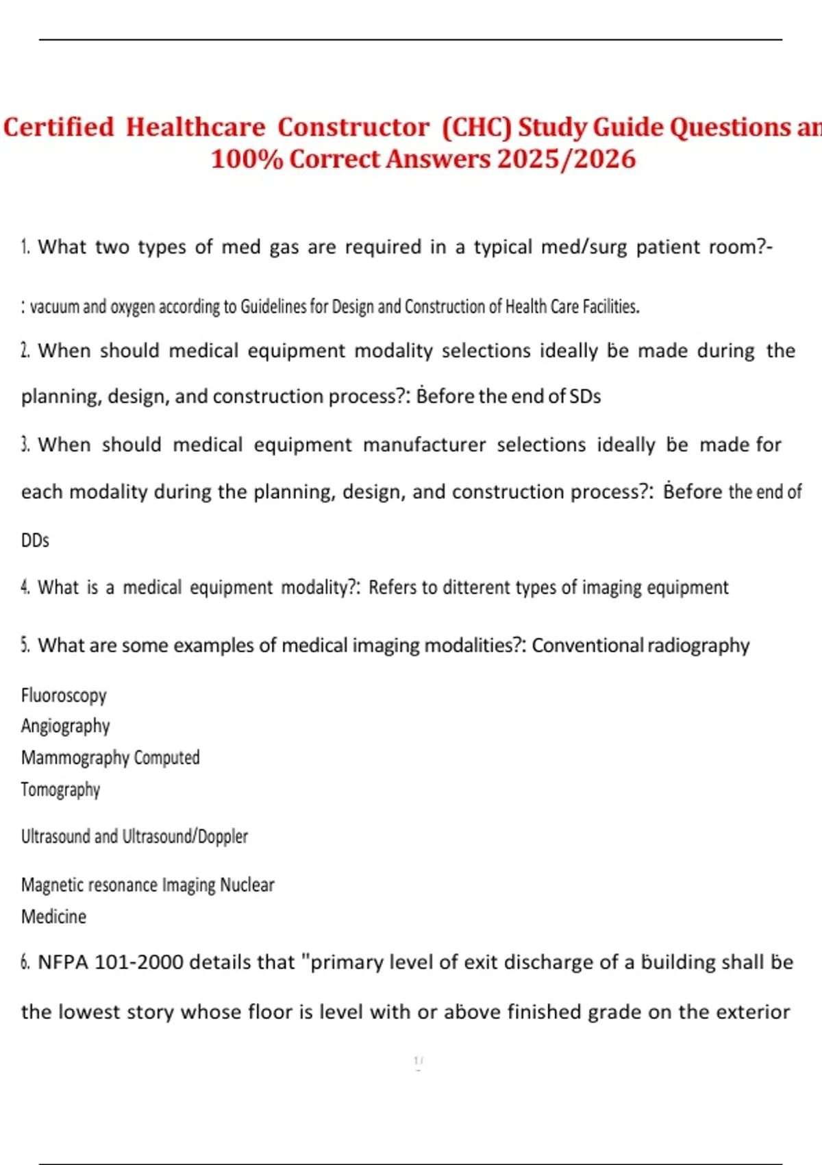 This CHC study guide for 2025/2026 provides a complete set of updated exam-style questions with fully verified 100% correct answers. It covers all major domains of the CHC certification, including healthcare construction management, regulatory compliance, safety protocols, facility operations, and project coordination. Designed to align with the current CHC exam blueprint, this resource supports learners in mastering key concepts and preparing confidently for certification.