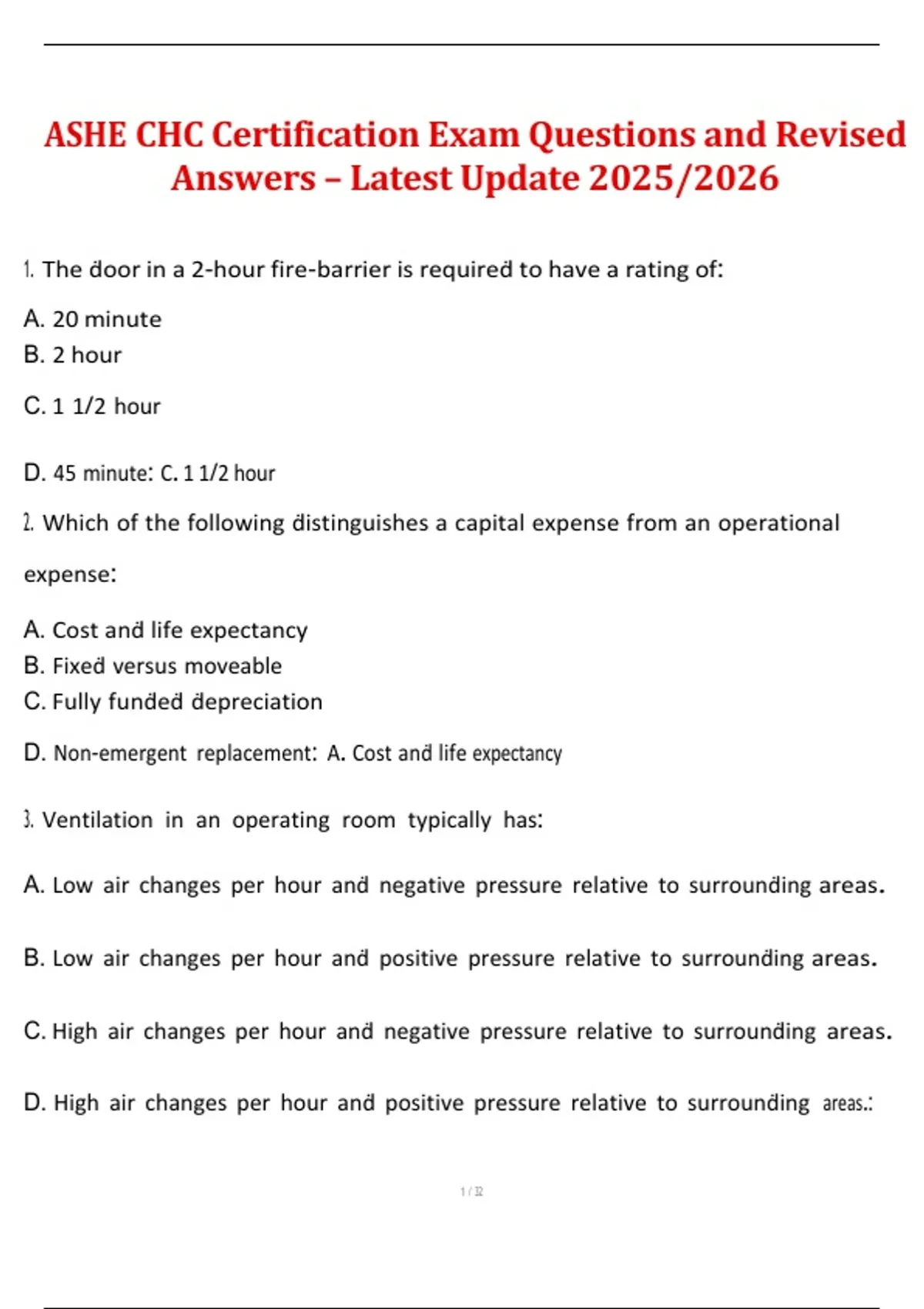 This ASHE CHC certification study guide for 2025/2026 provides a thoroughly updated collection of exam-style questions paired with revised and verified answers. It covers essential areas of healthcare construction, including regulatory compliance, risk management, project coordination, safety standards, and facility operations. Structured to align with the latest ASHE CHC exam framework, this resource supports comprehensive preparation for candidates seeking certification.