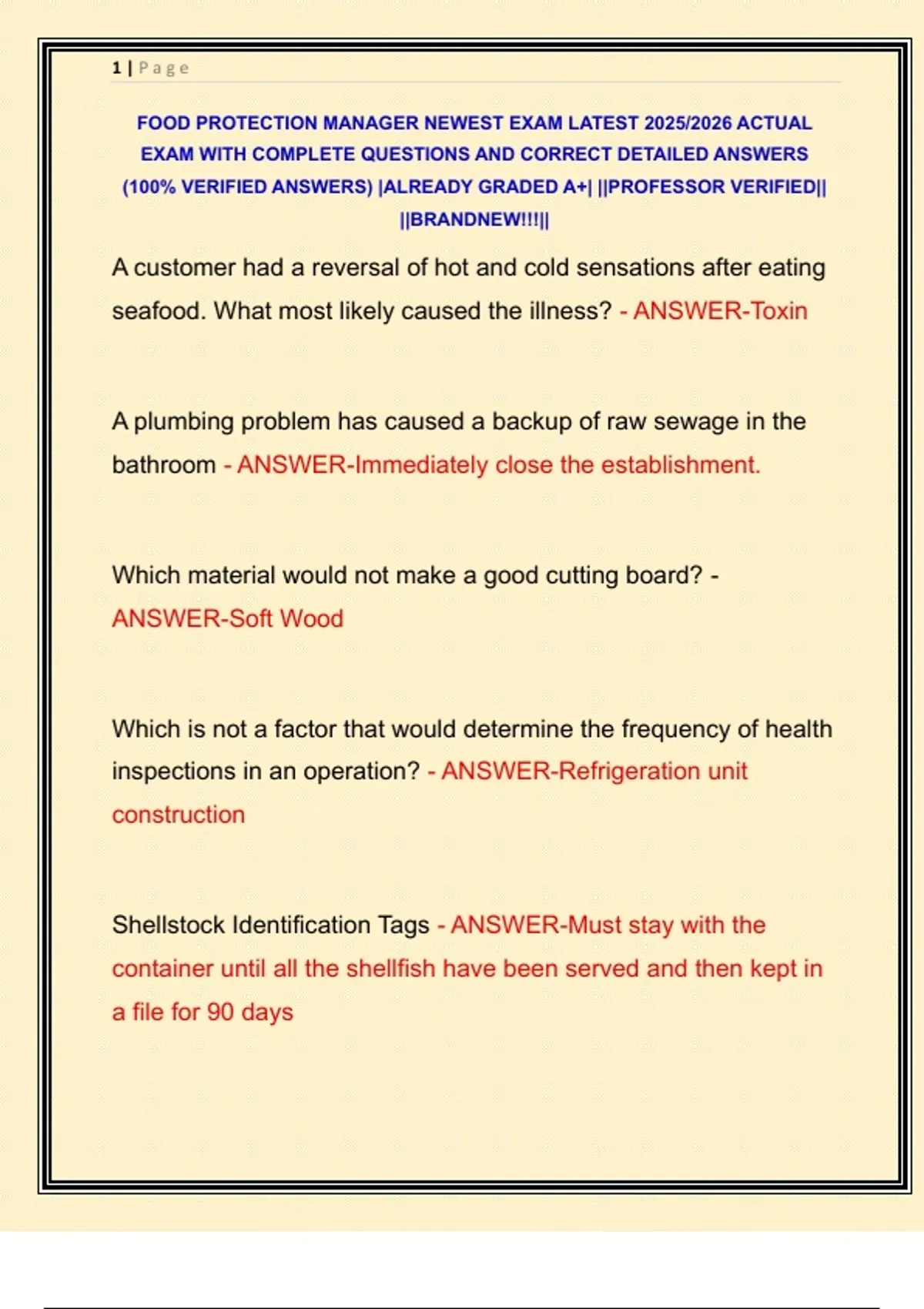 FOOD PROTECTION MANAGER NEWEST EXAM LATEST 2025/2026 ACTUAL