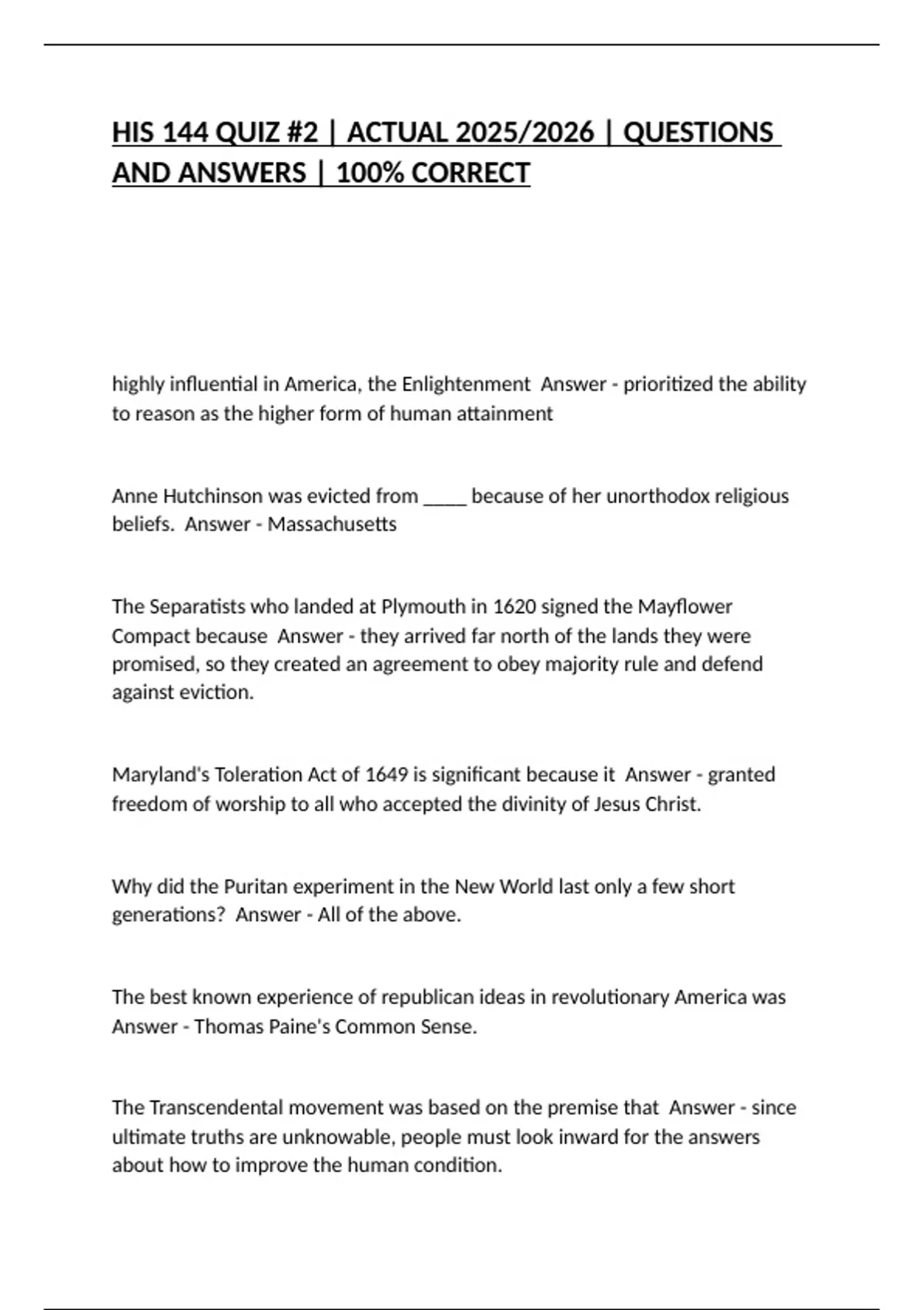 HIS 144 QUIZ #2 | ACTUAL 2025/2026 | QUESTIONS AND ANSWERS | 100% CORRECT