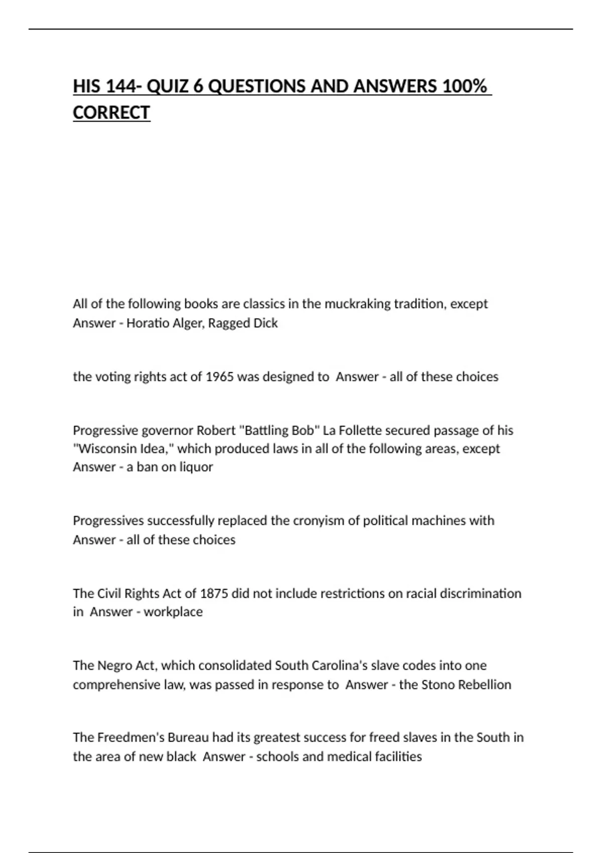 HIS 144- QUIZ 6 QUESTIONS AND ANSWERS 100%