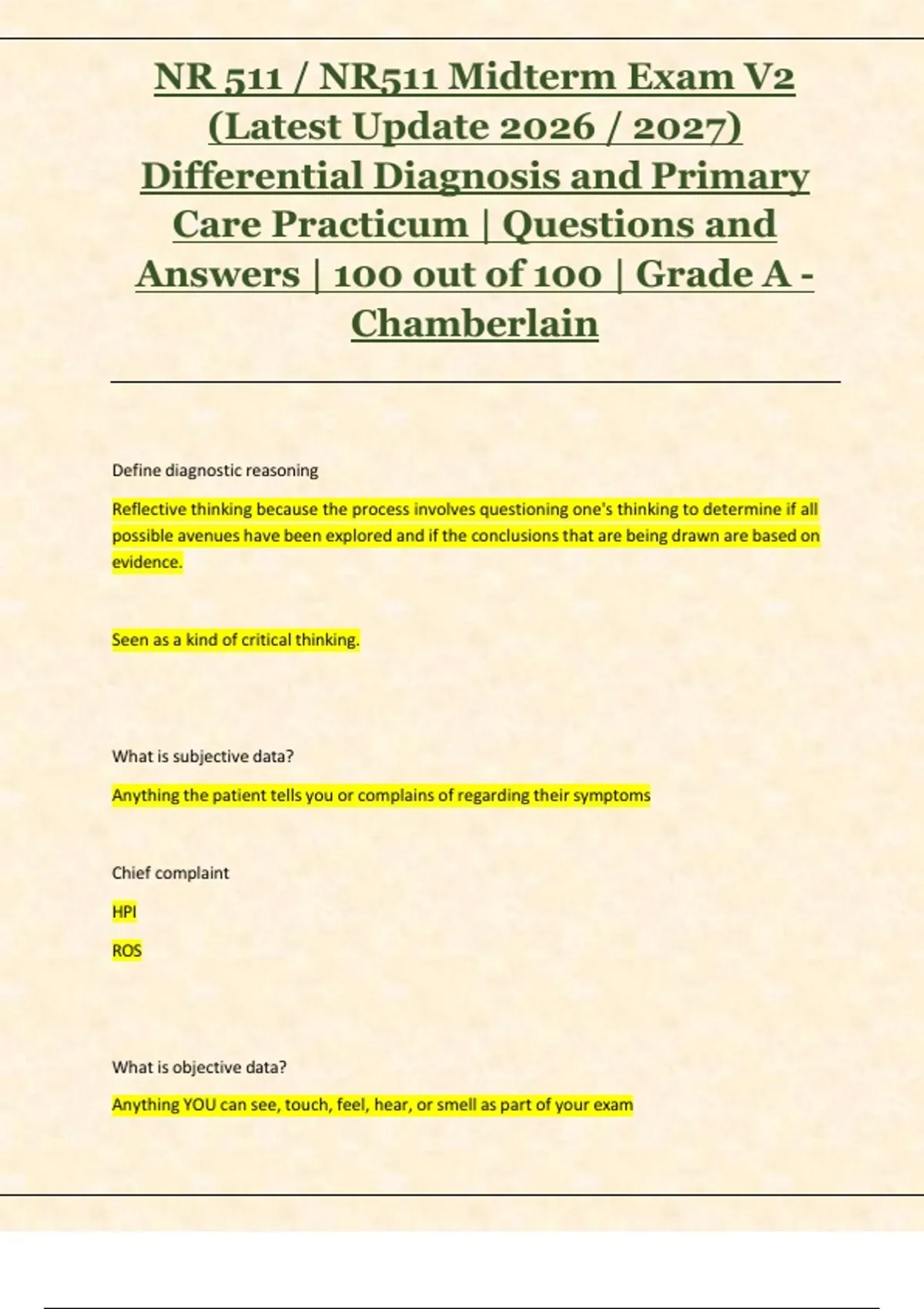 Version 2 of the NR 511 2026/2027 Midterm offers a fresh set of accurate, exam-style questions and verified answers tailored to Chamberlain’s NP curriculum. It emphasizes diagnostic interpretation, clinical patterns, patient case evaluation, and appropriate management choices. This resource is ideal for students seeking additional practice or looking for a second high-quality version to reinforce understanding before the actual exam.