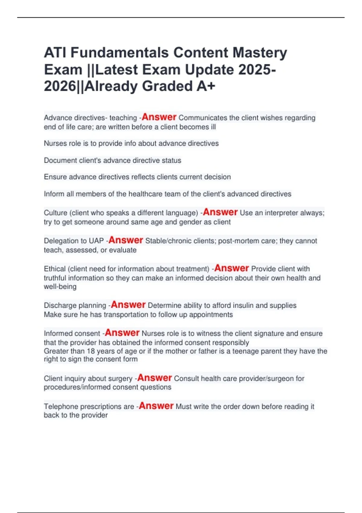 Advance directives- teaching -Answer Communicates the client wishes regarding