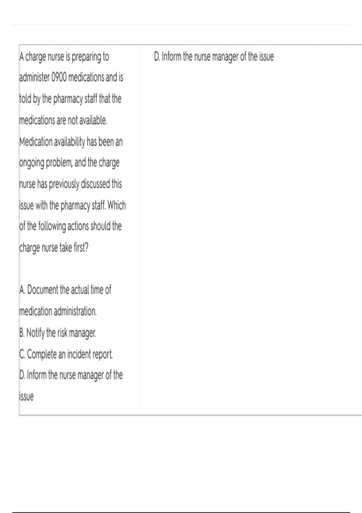 A charge nurse is preparing to D. Inform the nurse manager of the issue