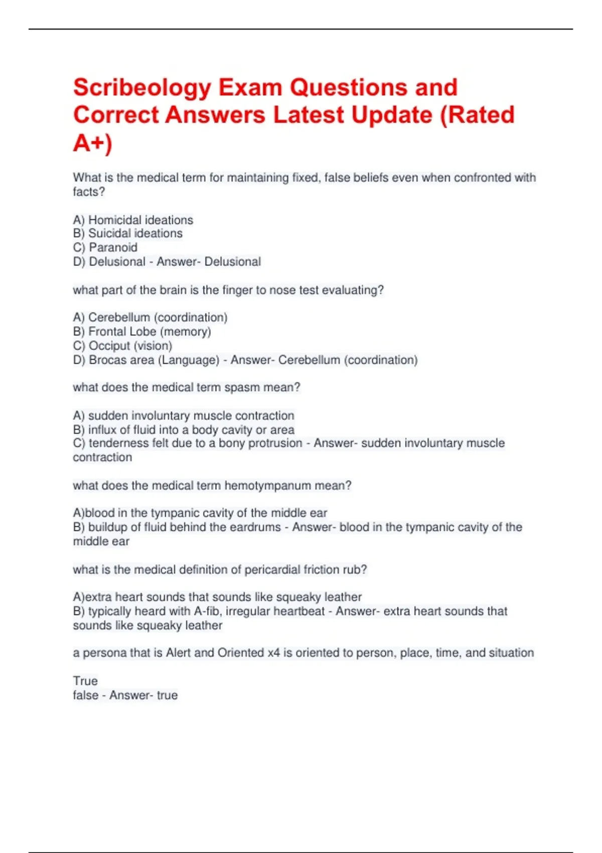 Scribeology Exam Questions and Correct Answers Latest Update (Rated A+) What is the medical term for maintaining fixed, false beliefs even when confronted with facts? A) Homicidal ideations B) Suicidal ideations C) Paranoid D) Delusional - Answer- Delusional what part of the brain is the finger to nose test evaluating? A) Cerebellum (coordination) B) Frontal Lobe (memory) C) Occiput (vision) D) Brocas area (Language) - Answer- Cerebellum (coordination) what does the medical term spasm mean? A) sudden involuntary muscle contraction B) influx of fluid into a body cavity or area C) tenderness felt due to a bony protrusion - Answer- sudden involuntary muscle contraction what does the medical term hemotympanum mean? A)blood in the tympanic cavity of the middle ear B) buildup of fluid behind the eardrums - Answer- blood in the tympanic cavity of the middle ear what is the medical definition of pericardial friction rub? A)extra heart sounds that sounds like squeaky leather B) typically heard with A-fib, irregular heartbeat - Answer- extra heart sounds that sounds like squeaky leather a persona that is Alert and Oriented x4 is oriented to person, place, time, and situation True false - Answer- true what does the medical term auscultation mean? A) act of listening with a stethoscope B) inability to hear C) audible chest pain - Answer- act of listening with a stethoscope what does the medical term pruritic mean? A) itchy B) red C) pus filled - Answer- itchy what diagnosis does a positive (pain is present) straight leg raise indicate? A) Sciatica B) Hemorrhoids C) Fracture - Answer- Sciatica what does the medical term murmur mean? A) extra heart sound resembling a "whooshing" sound B) heart beating normally C) coughing up blood - Answer- extra heart sound resembling a "whooshing" sound what the definition of an obese person? A) BMI greater than 10 B) BMI greater than 20 C) BMI greater than 30 D) BMI greater than 40 - Answer- BMI greater than 30 what does the medical term fluctuance mean? A) capable of being moved or compressed; an indication of the presence of pus in a bacteria infection B) solid, raised lesion with distinct borders C) red area on the skin that is covered with small bumps D)tenderness of the muscles surrounding the spine - Answer- capable of being moved or compressed; an indication of the presence of pus in a bacteria infection what is the meaning of the medical term sublingual? A)under the tongue B) by mouth C) under the skin - Answer- under the tongue what is the medical term that means that the heart is beating normally? - Answer- Regular rate and rhythm what does the medical term wheezes mean? A) air moving through a tight, constricted space B) sound of liquid in the lungs C) breathing in - Answer- air moving through a tight, constricted space what is the medical term for a dental cavity - Answer- dental carie what is the medical term for inability to open the jaw? - Answer- trismus what does the term adnexal tenderness mean? A) tenderness over the ovaries or Fallopian tubes B) movement of the cervix causes pain C) inflamed veins in the rectum and anus - Answer- tenderness over the ovaries or Fallopian tubes what does the medical term phimosis mean? A) condition where a tight foreskin cannot be retracted over the head of the penis B) prolonged erection of the penis without sexual arousal C) inflamed veins in the rectum and anus - Answer- condition where a tight foreskin cannot be retracted over the head of the penis what does the term rhinorrhea mean - Answer- runny noes what medical term means the heart is beating abnormally without any pattern? - Answer- irregularly irregular what is the definition of a hemorrhoid? A) inflamed veins in the rectum and anus B) tenderness over the ovaries or Fallopian tubes C) release of fluid or substances - Answer- inflamed veins in the rectum and anus which of these is not a Meningeal sign? A) photophobia B) Rigid Neck C) headache D) tracheal deviation - Answer- photophobia what is the medical term for ear wax buildup? - Answer- cerumen impaction induration is area of cyanosis due to a drug reaction? True False - Answer- false the uterus is located in the suprapubic area of the abdomen true false - Answer- true what part of the body does a C Collar go onto? - Answer- heck/neck what does the medical term Raccoon Eyes mean? A) ecchymosis in the periorbital area B) darkening of the eyes due to rabies infection C) bruising over the mastoid process - Answer- ecchymosis in the periorbital area what does the medical term balanitis mean? A)inflammation of the foreskin and head of the penis B) prolonged erection of the penis without sexual arousal C) penile discharge - Answer- inflammation of the foreskin and head of the penis what is the medical term for bruising - Answer- ecchymosis the medical term for having a Fever is Emaciated true false - Answer- false what is the definition of homicidal ideation - Answer- a plan to hurt another person what is the medical term for a patient the immediately post-seizure? A) post-ictal B) post seizure C) febrile - Answer- post-ictal edema (swelling) of the legs that leaves an indentation when pressed is called what? - Answer- pitting edema what does the medical term priapism mean? A) prolonged erection of the penis without sexual arousal B) inflammation of the foreskin and head of the penis C) swelling of the testicles - Answer- prolonged erection of the penis without sexual arousal