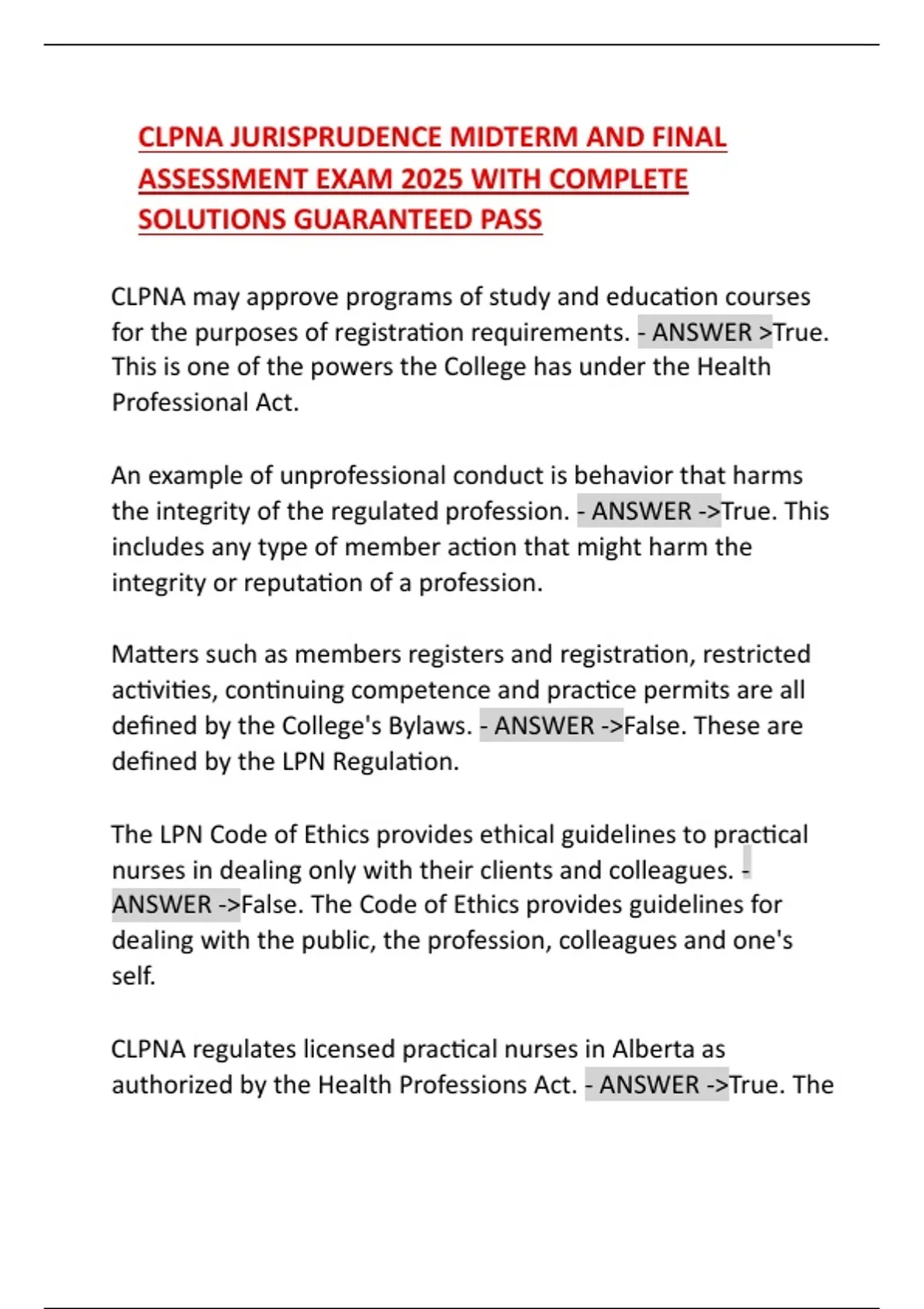 Prepare for the CLPNA Jurisprudence Midterm and Final Assessment Exam 2025 with verified answers. Covers Health Professions Act, ethics, scope of practice, complaints process, and more. Guaranteed pass support for LPNs in Alberta.