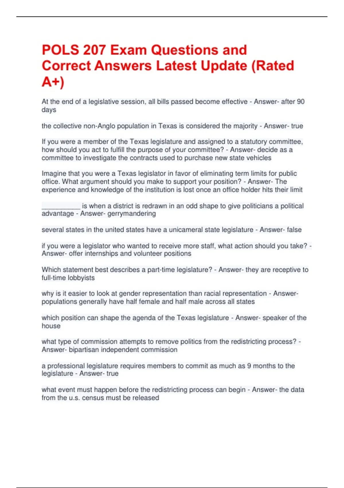 POLS 207 Exam Questions and Correct Answers Latest Update (Rated A+) At the end of a legislative session, all bills passed become effective - Answer- after 90 days the collective non-Anglo population in Texas is considered the majority - Answer- true If you were a member of the Texas legislature and assigned to a statutory committee, how should you act to fulfill the purpose of your committee? - Answer- decide as a committee to investigate the contracts used to purchase new state vehicles Imagine that you were a Texas legislator in favor of eliminating term limits for public office. What argument should you make to support your position? - Answer- The experience and knowledge of the institution is lost once an office holder hits their limit __________ is when a district is redrawn in an odd shape to give politicians a political advantage - Answer- gerrymandering several states in the united states have a unicameral state legislature - Answer- false if you were a legislator who wanted to receive more staff, what action should you take? - Answer- offer internships and volunteer positions Which statement best describes a part-time legislature? - Answer- they are receptive to full-time lobbyists why is it easier to look at gender representation than racial representation - Answer- populations generally have half female and half male across all states which position can shape the agenda of the Texas legislature - Answer- speaker of the house what type of commission attempts to remove politics from the redistricting process? - Answer- bipartisan independent commission a professional legislature requires members to commit as much as 9 months to the legislature - Answer- true what event must happen before the redistricting process can begin - Answer- the data from the u.s. census must be released