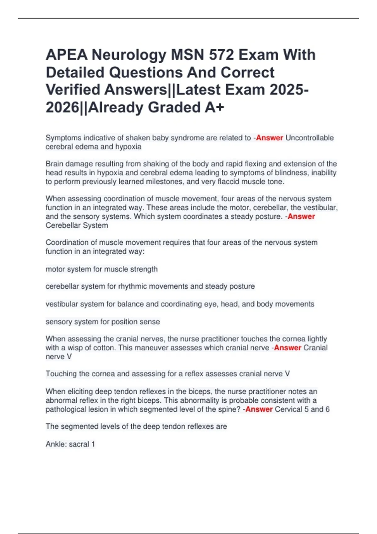 APEA Neurology MSN 572 Exam With Detailed Questions And Correct Verified Answers||Latest Exam 2025 2026||Already Graded A+
